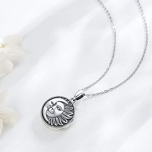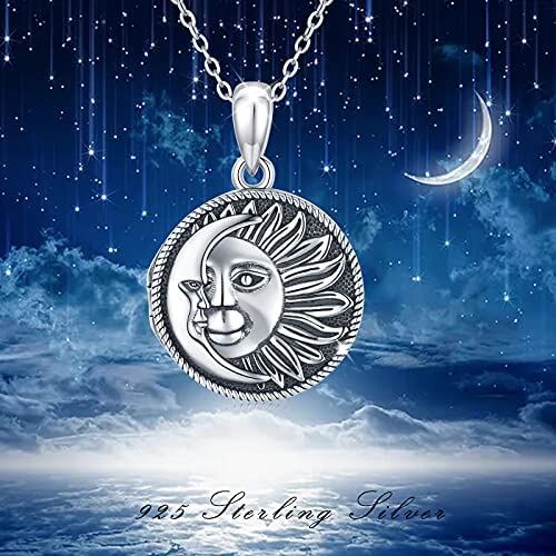 This no-stone Personalized Photo Locket Necklace is Crafted from High-Quality Sterling Silver with White Gold Plating, featuring Delicately Engraved Moon and Sun Motifs.