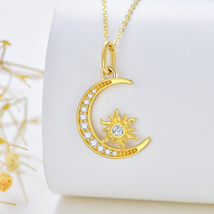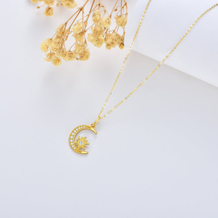 14K Gold Round Zircon Moon & Sun Pendant Necklace