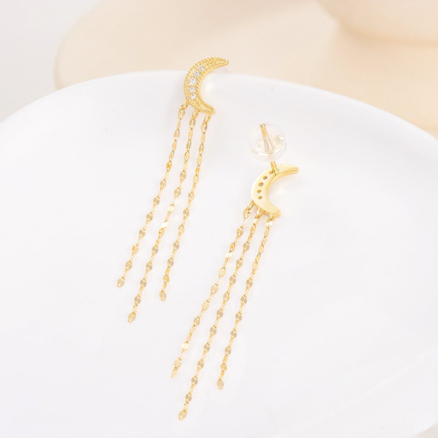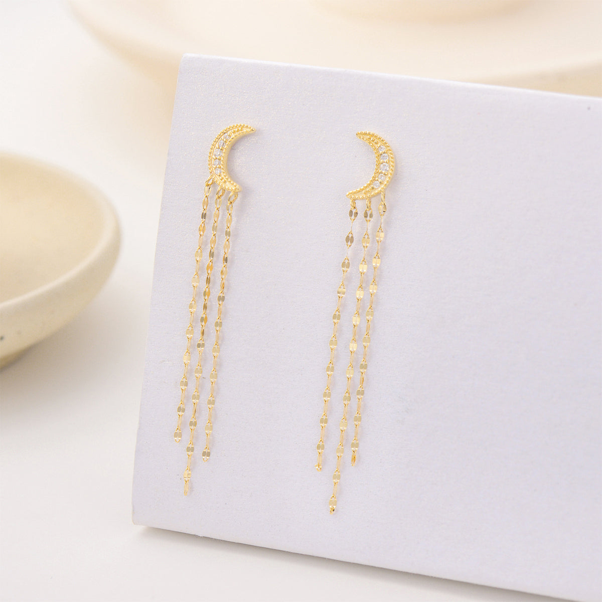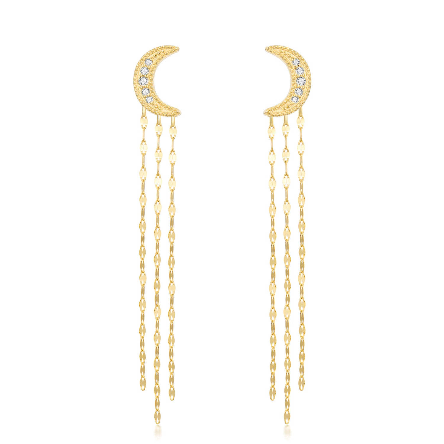 These 14K Gold Circular Shaped Moissanite Moon Drop Earrings by YFN are an exquisite pair designed for women who cherish celestial beauty and sophisticated elegance. Crafted from high-quality 14K gold, the classic circular drop design is enhanced with a delicate moon motif, perfectly highlighted by sparkling clear Moissanite gemstones. They offer stunning clarity and brilliance, making them versatile for both special occasions and daily wear. These earrings are an essential addition for adding a touch of grace and timeless luxury.