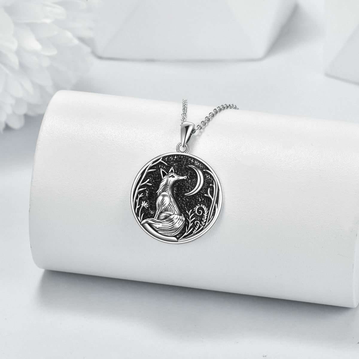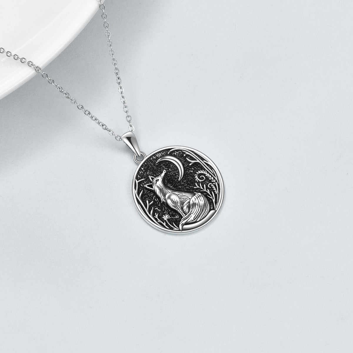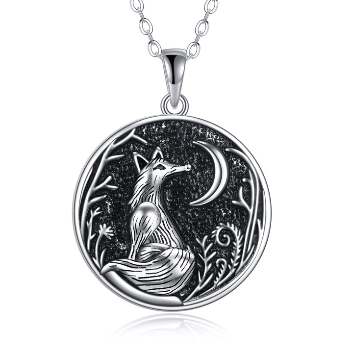 Sterling Silver Round Fox & Moon Pendant Necklace