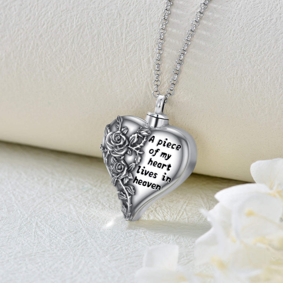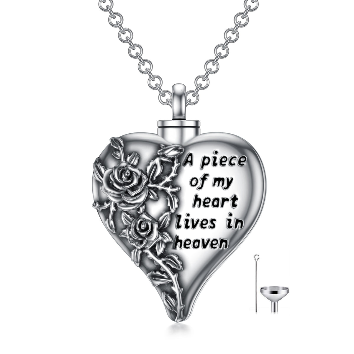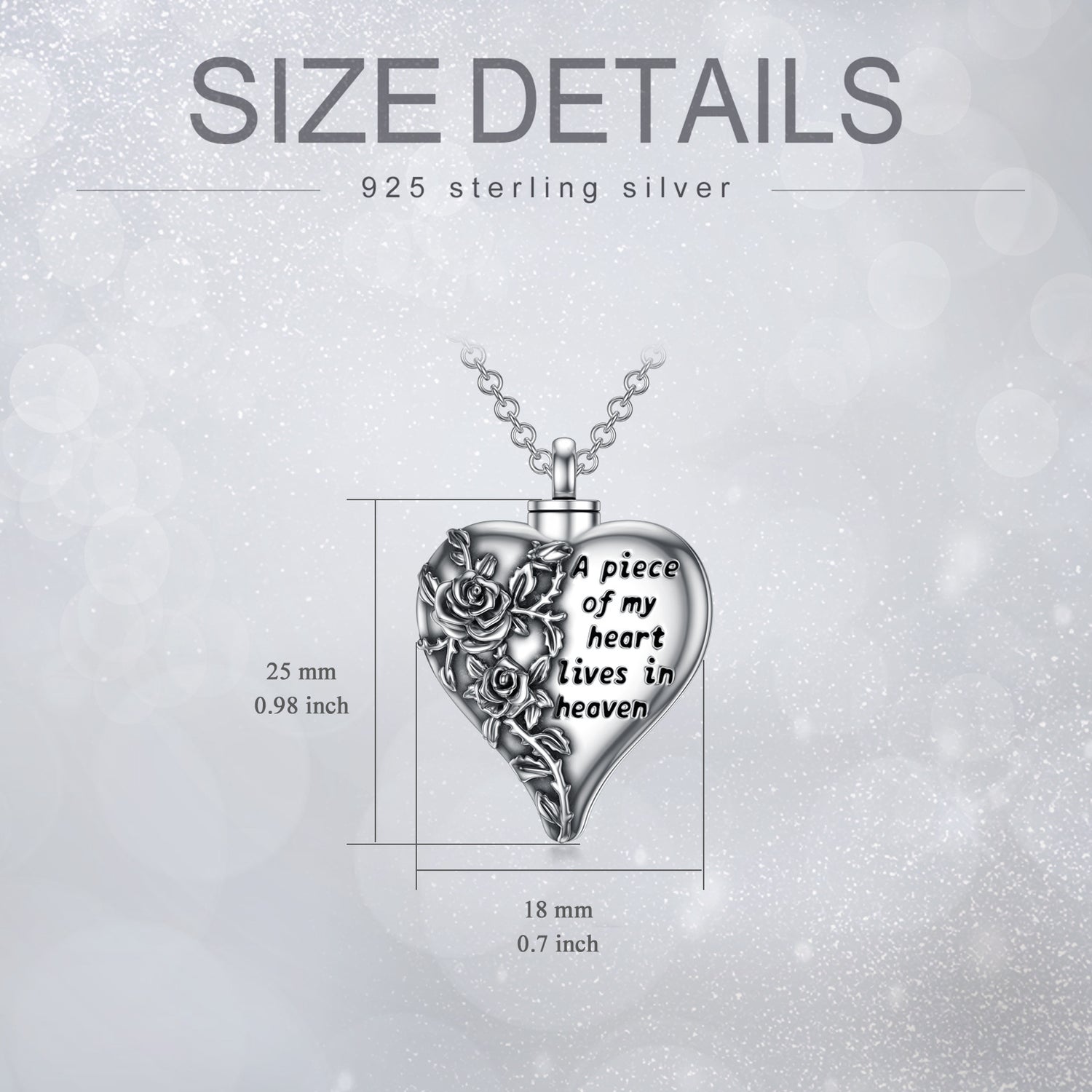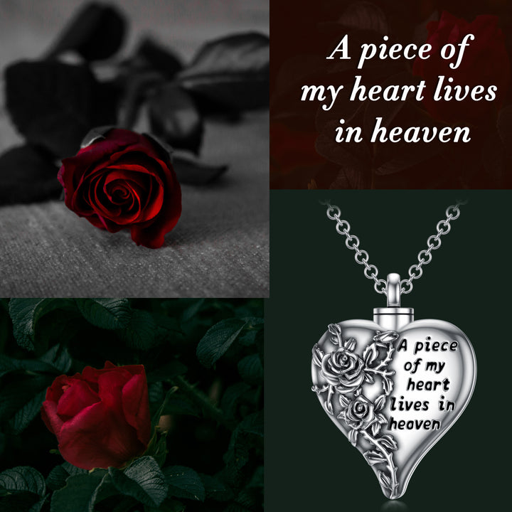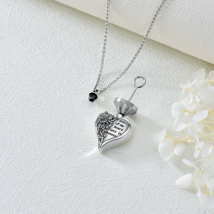 This Heart-Shaped Urn Necklace for Ashes is crafted from Premium Sterling Silver with a Retro Silver finish, featuring the inscription "A piece of my heart is in heaven."