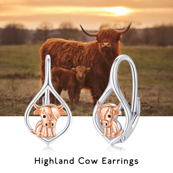 These no-stone Women's Lever-back Earrings are crafted from Sterling Silver (Two-tone: Silver and Rose Gold), Featuring an Adorable Highland Cow Motif.