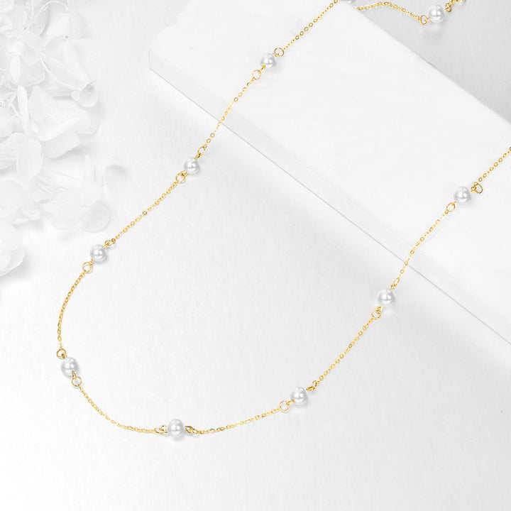 This necklace is crafted from solid 14K Gold and features interspersed, circular White Pearl Beads in a delicate station chain design.