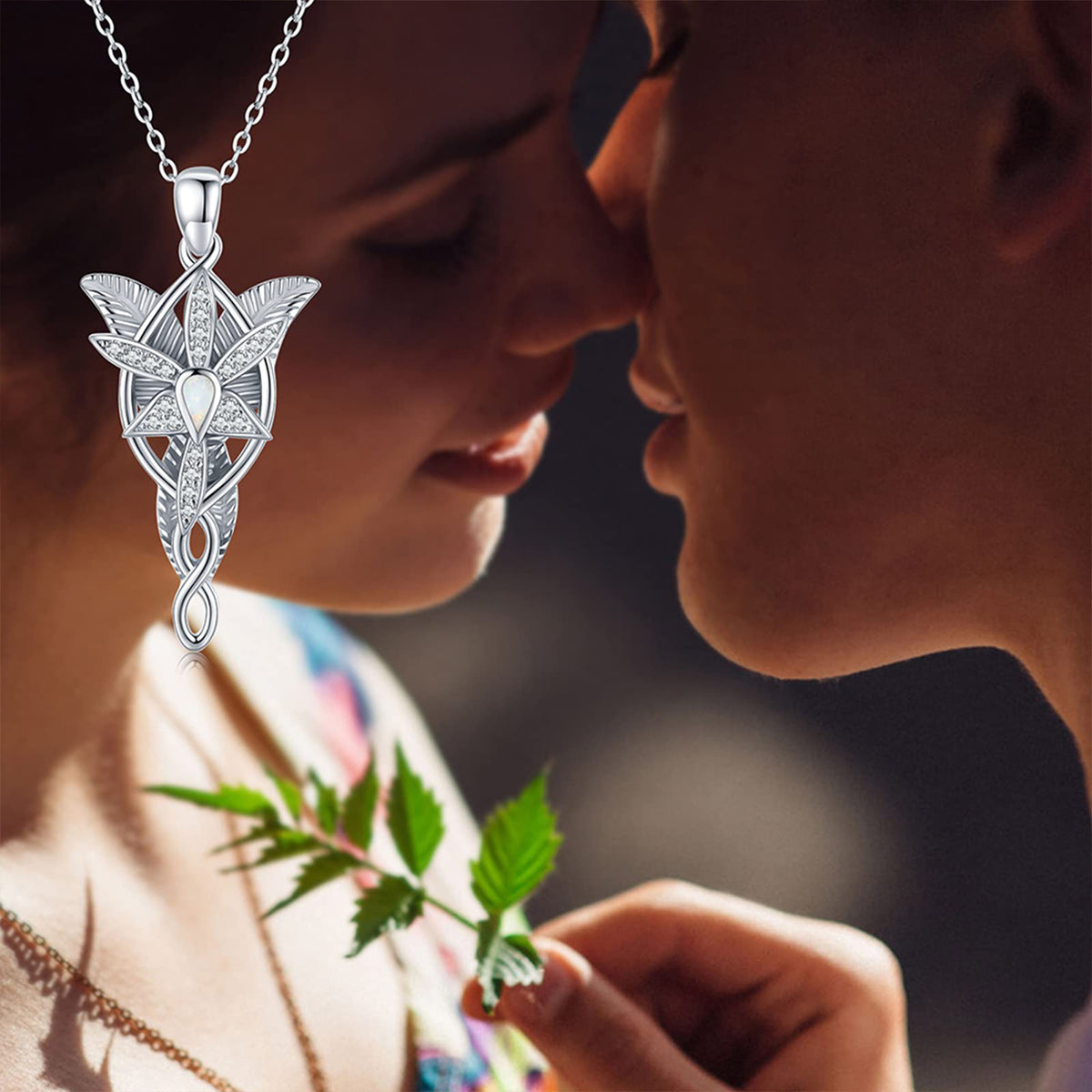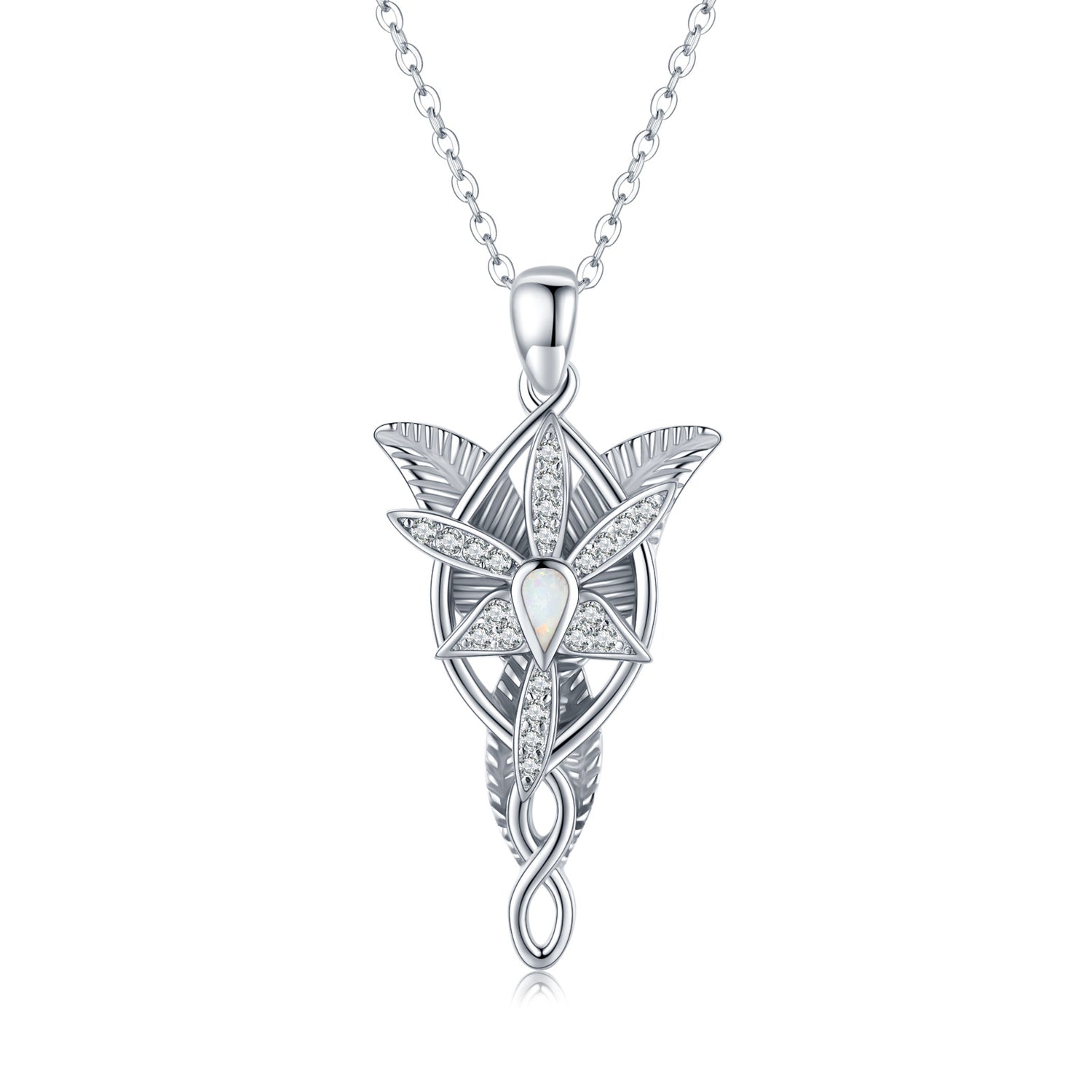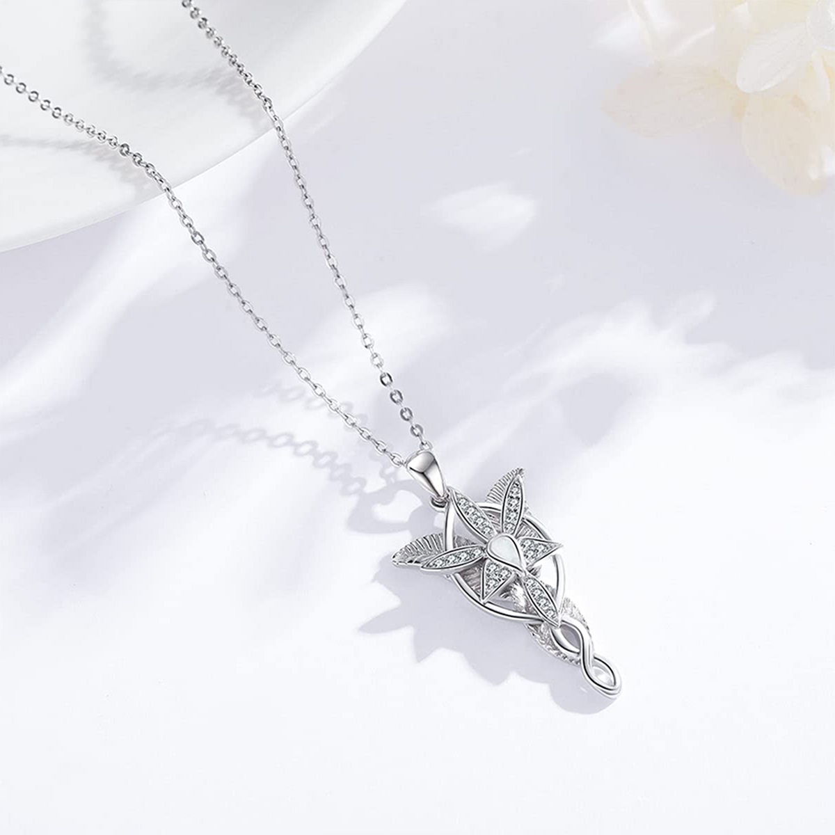 This Sterling Silver Opal Celtic Knot & Cross Arwen Evenstar Pendant Necklace by YFN is an exquisite necklace for women, blending heritage and modernity in a retro silver style. Crafted from Sterling silver, it features a mesmerizing opal set within an intricate Celtic knot and cross design, making it a timeless and sophisticated accessory.