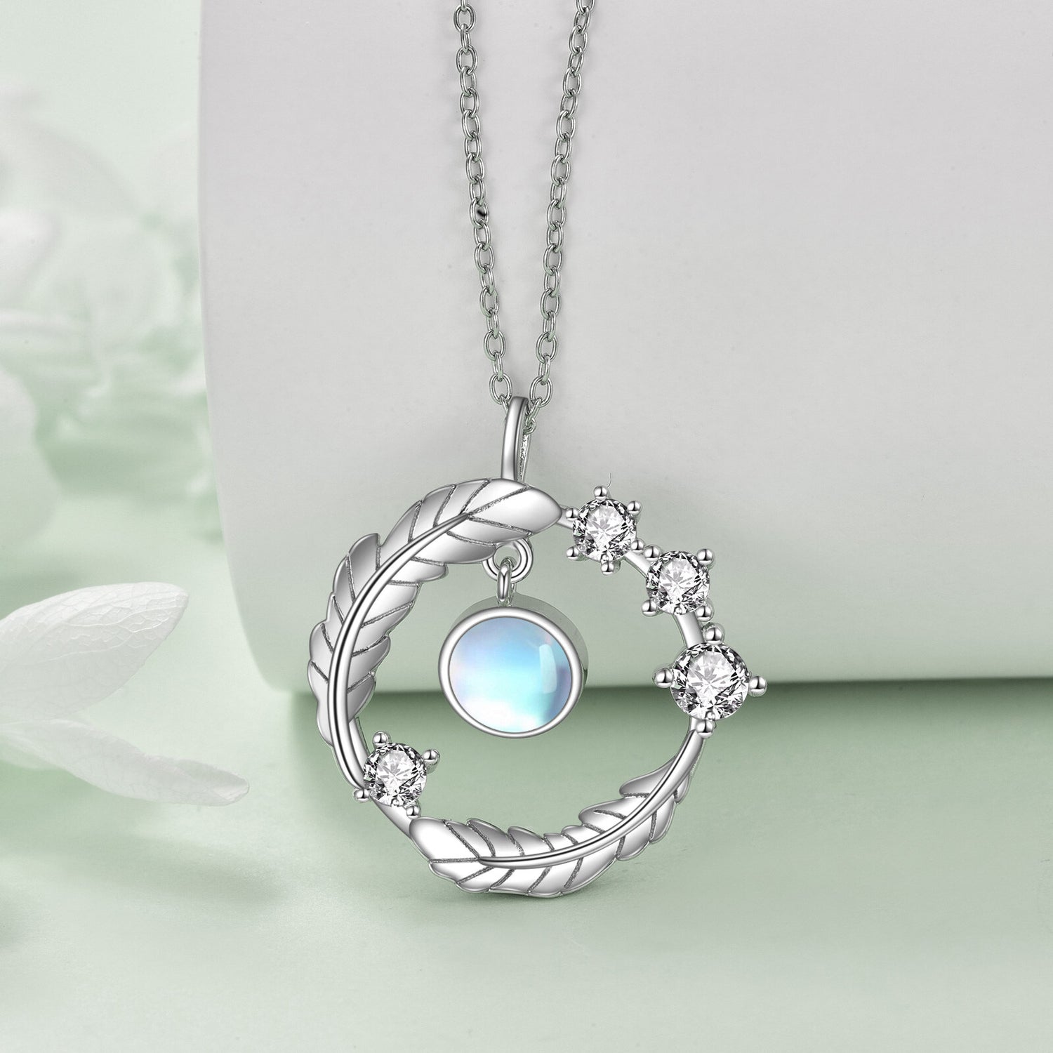 Sterling Silver Round Moonstone Leaves Pendant Necklace
