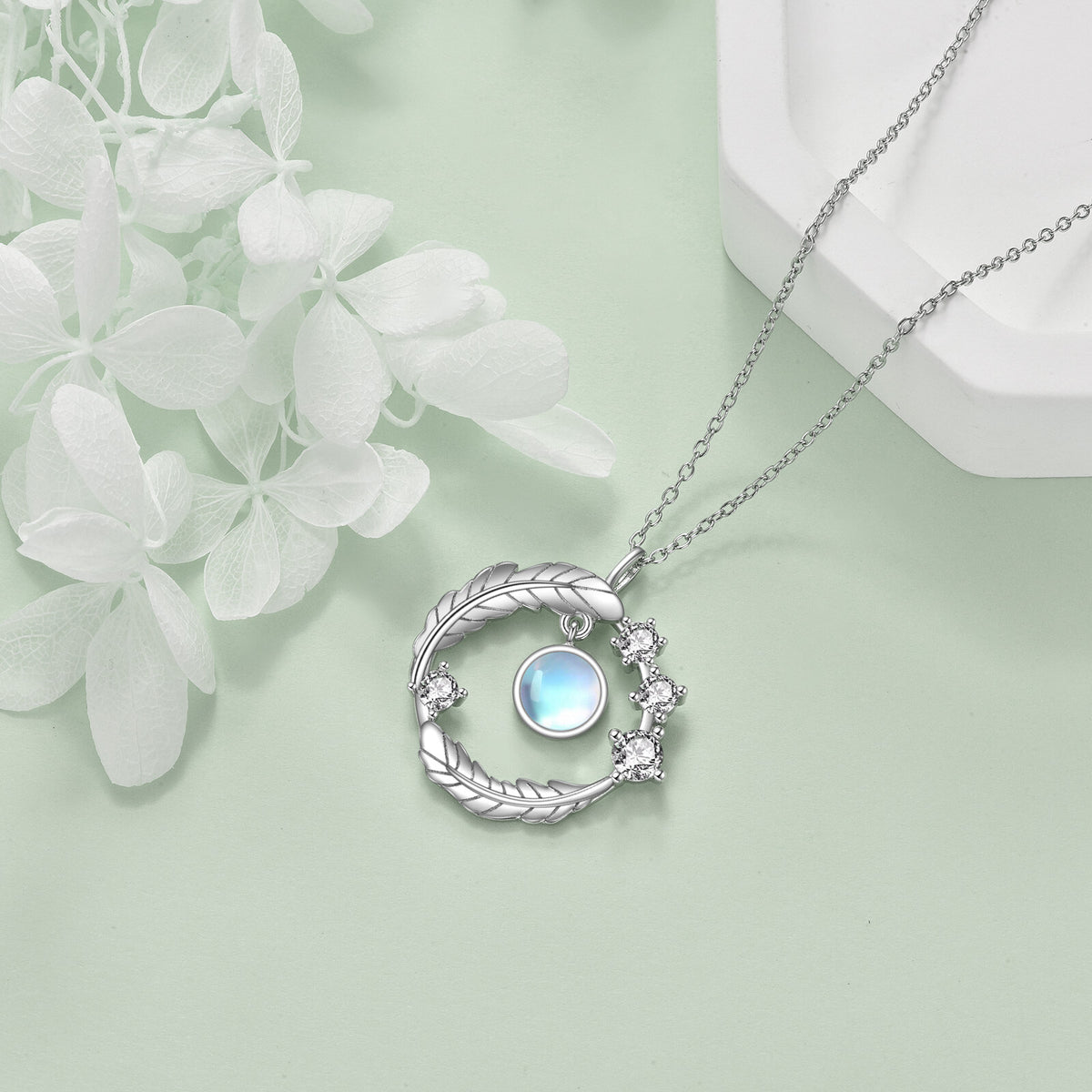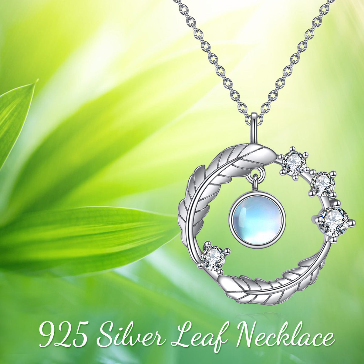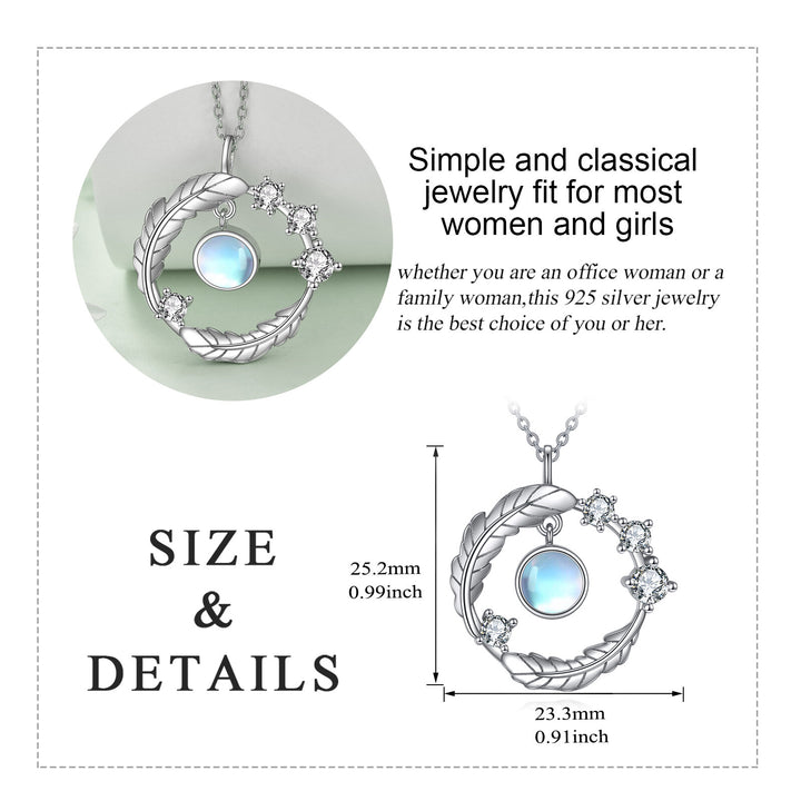This Sterling Silver Round Moonstone Leaves Pendant Necklace by YFN is an exquisite and sophisticated piece for women. Crafted from sterling silver and finished in luxurious white gold, this pendant showcases a mystical round moonstone enveloped by intricate leaf motifs, adding a touch of nature-inspired charm and ensuring lasting durability and radiance.