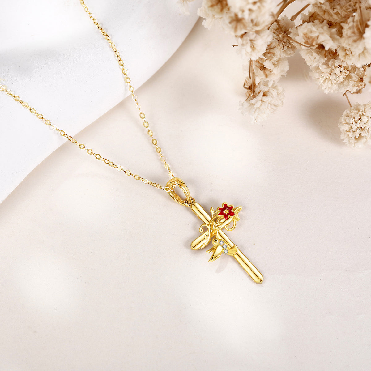 Crafted in 14K Gold, this Pendant Necklace features intricate Cubic Zirconia details and symbolic designs of a Hummingbird and Cross.