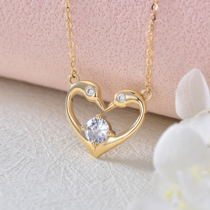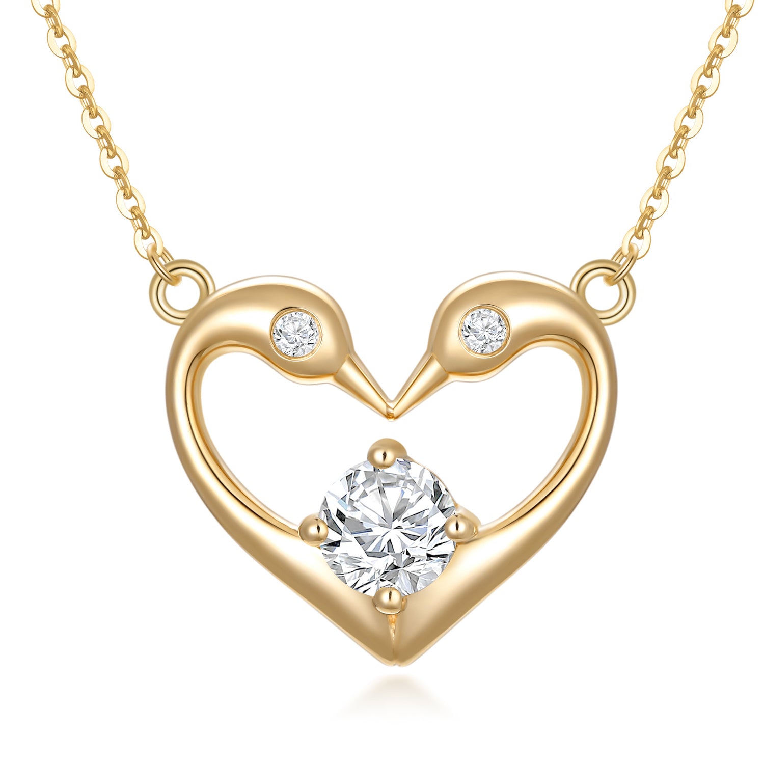 14K Gold Round Zircon Swan & Heart Pendant Necklace
