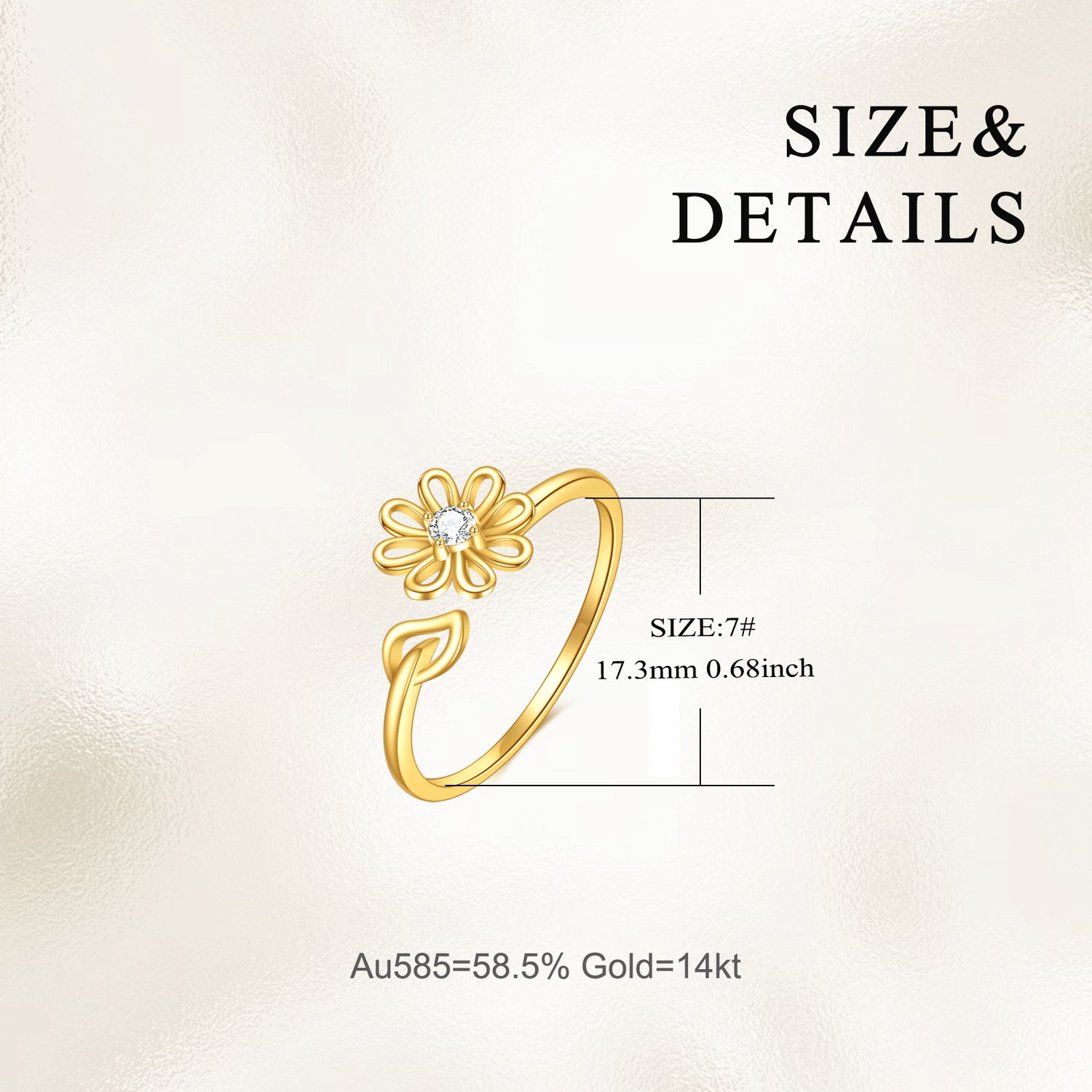 14K gold; clear Cubic Zirconia stones in daisy motif; open adjustable band.