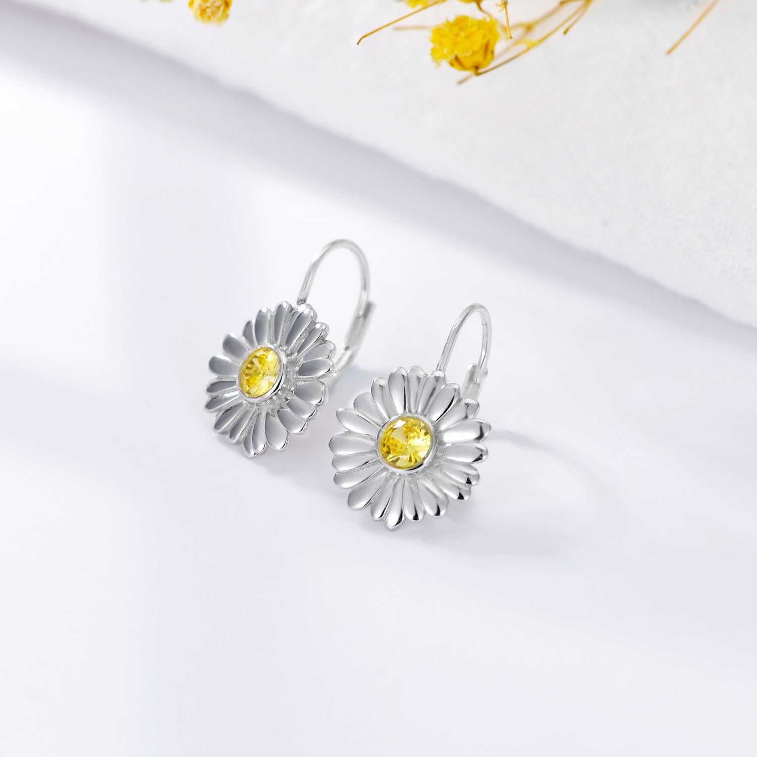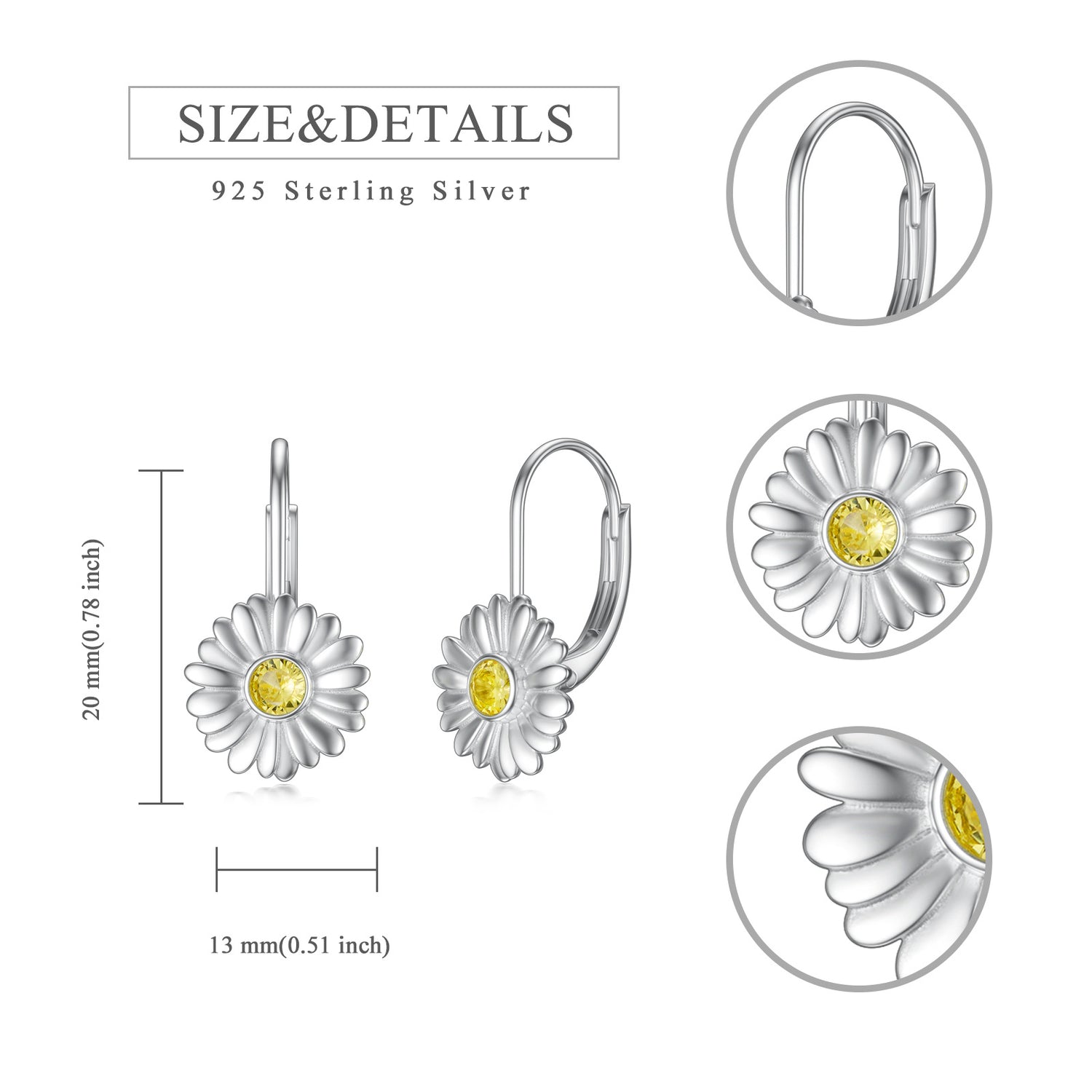 These Sterling Silver Two-tone Circular Shaped Cubic Zirconia Daisy Lever-back Earrings by YFN elevate a woman's style with vibrant yellow circular-shaped Cubic Zirconia stones set in a captivating Daisy design. Crafted from high-quality sterling silver with options for white gold and Yellow gold, these lever-back earrings blend timeless charm with modern sophistication.