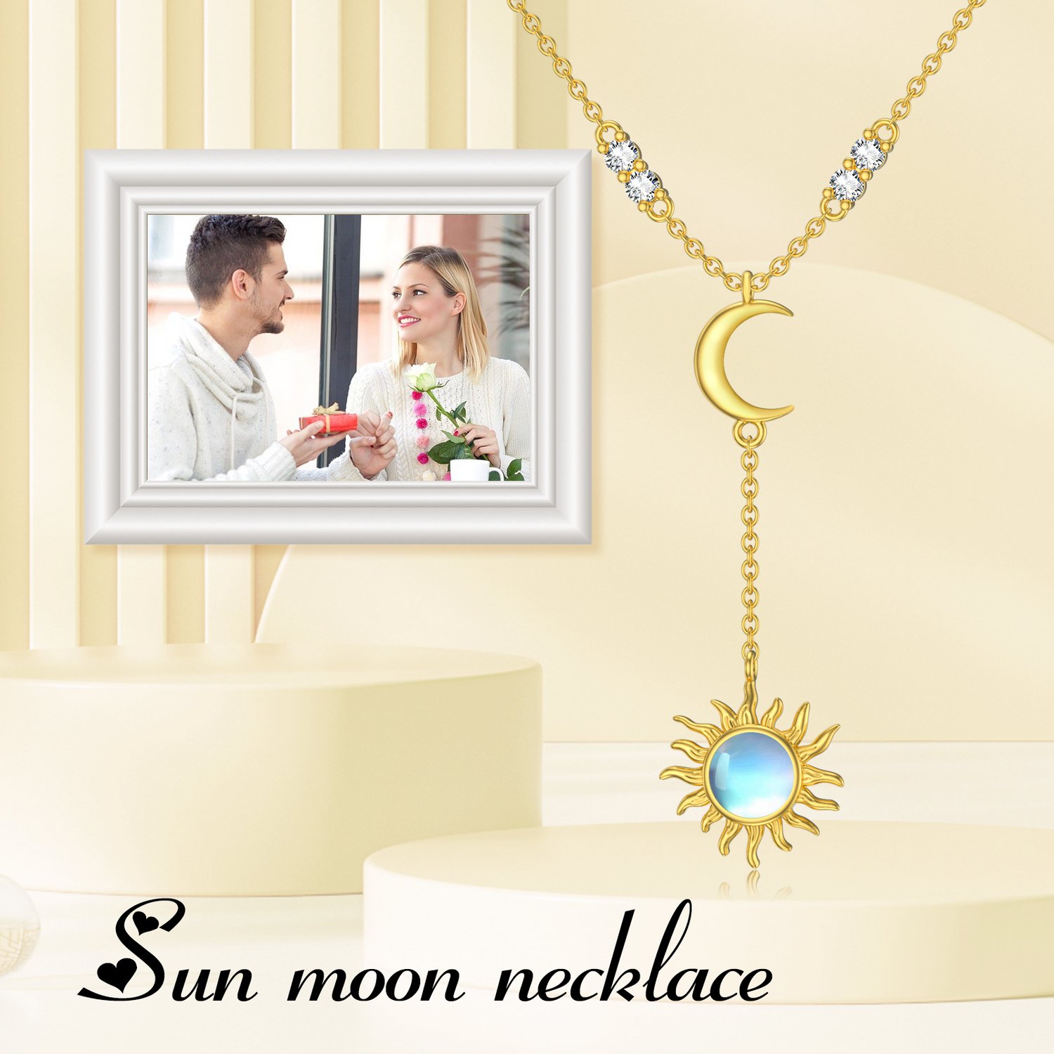 This Circular Shaped Adjustable Y Necklace is crafted from 14K Gold, Featuring Sun and Moon Motifs Adorned with a Mesmerizing Moonstone.
