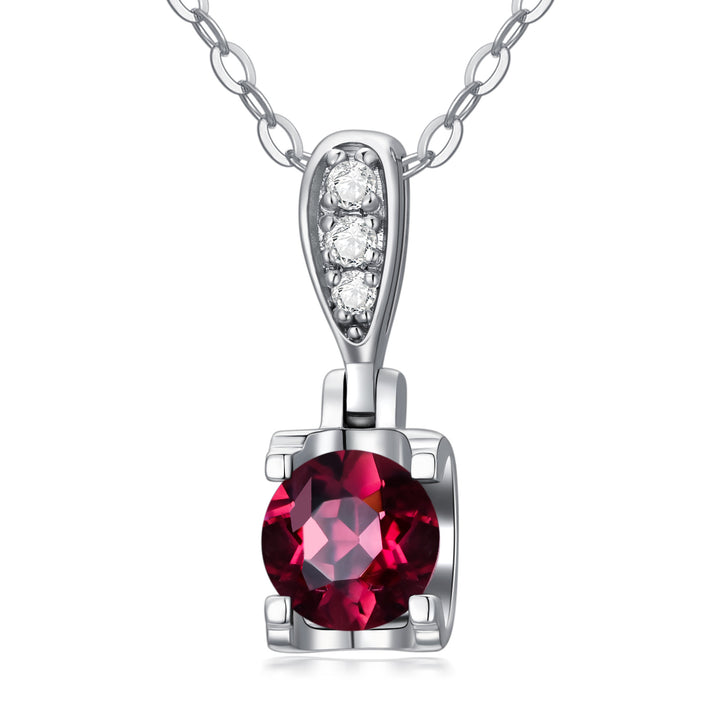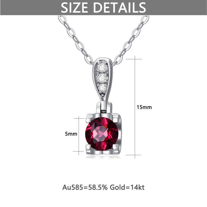 This pendant necklace is crafted from solid 14K White Gold and features a round design set with brilliant Red and White Cubic Zirconia stones, suspended from a white gold chain.