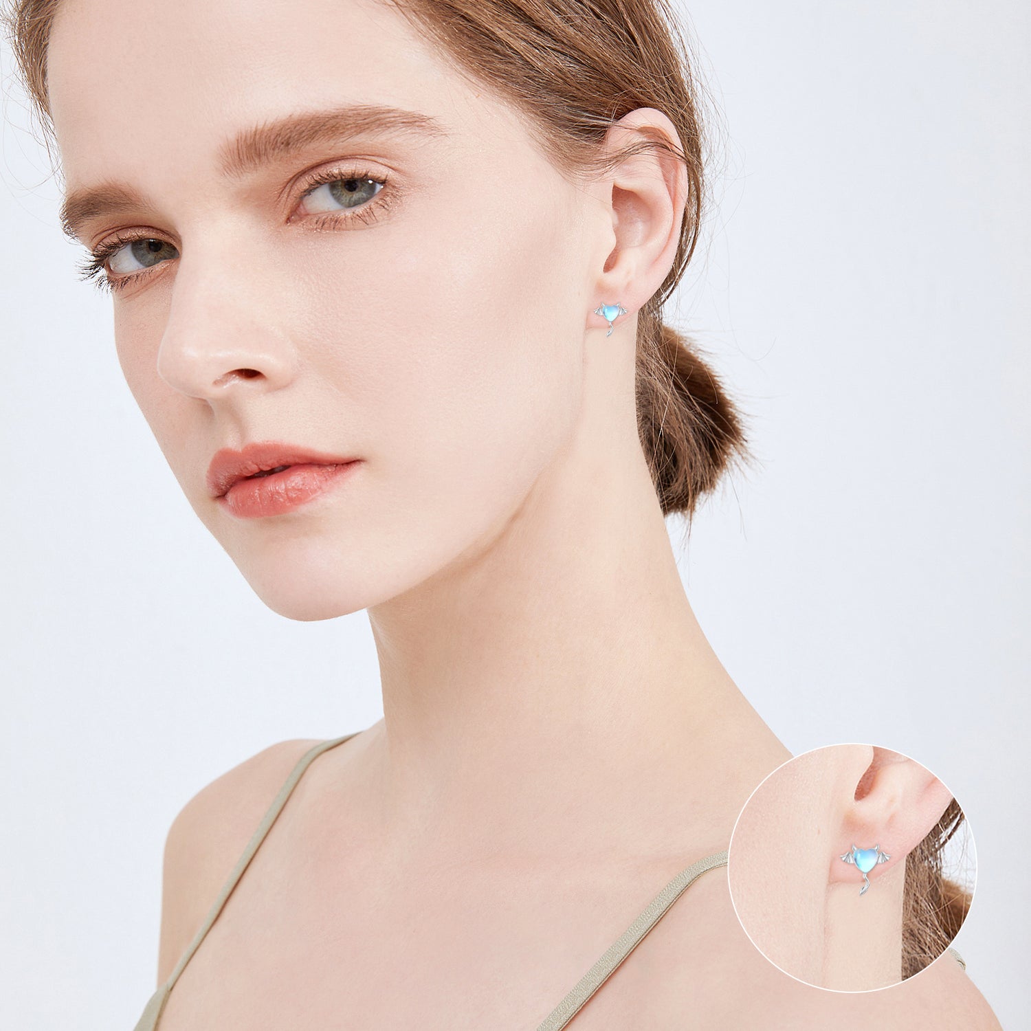 These Stud Earrings are crafted from Sterling Silver with White Gold Plating, Featuring a Moonstone Centerpiece Set in Angel & Heart Motifs.