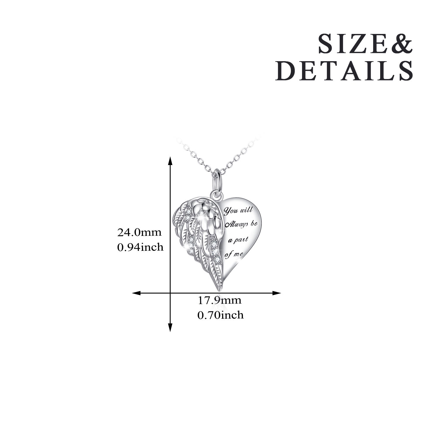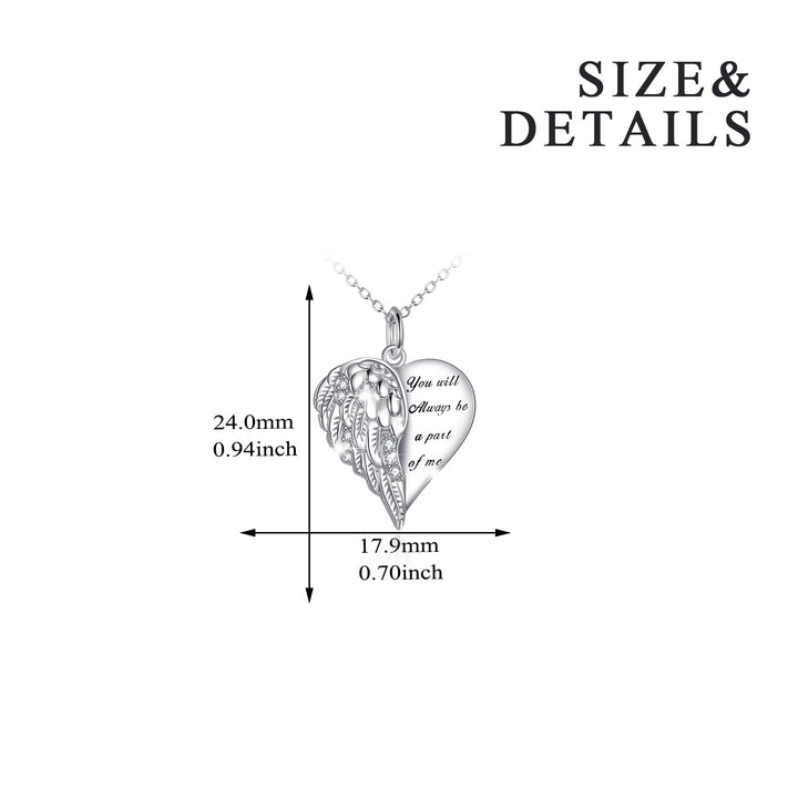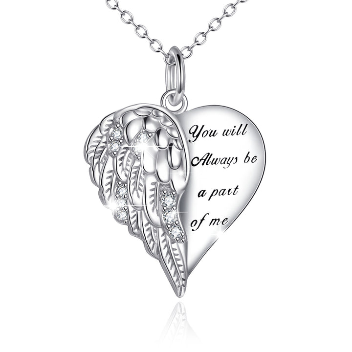 Crafted from Sterling Silver with White Gold Plating, featuring a Pendant Necklace with a Round Zircon Stone, Angel Wing, and Heart Motif. Inscribed with "You Will Always Be A Part Of Me."