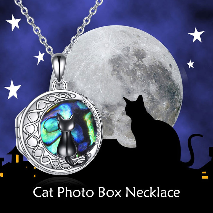 Made of sterling silver with white gold plating, featuring cat motif and photo locket compartment. Includes chain; locket dimensions per brand details.