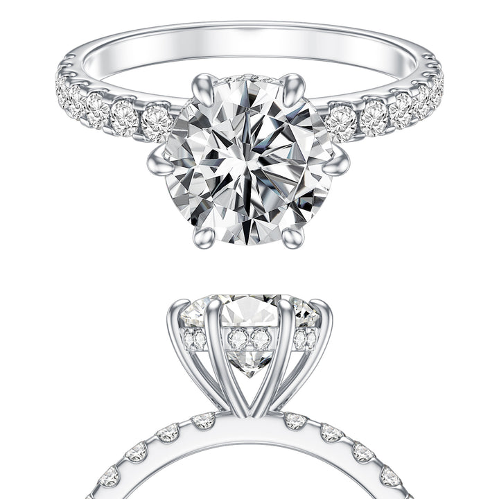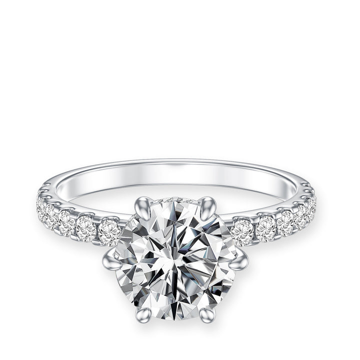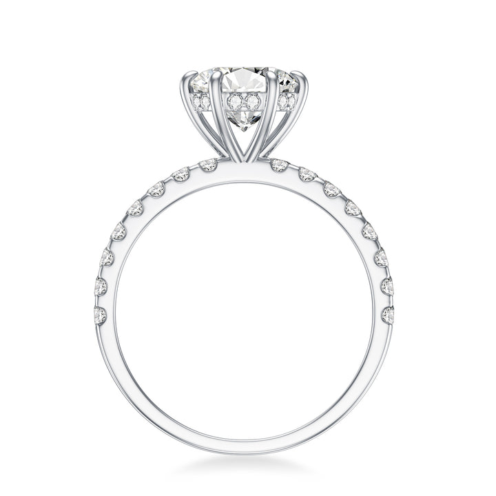 This Round Shaped Engagement Ring is Meticulously Crafted from 18K White Gold and features a Dazzling Clear Moissanite Center.