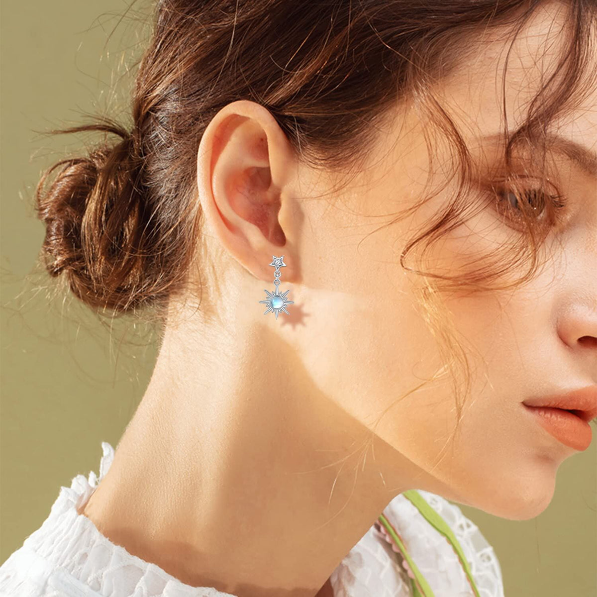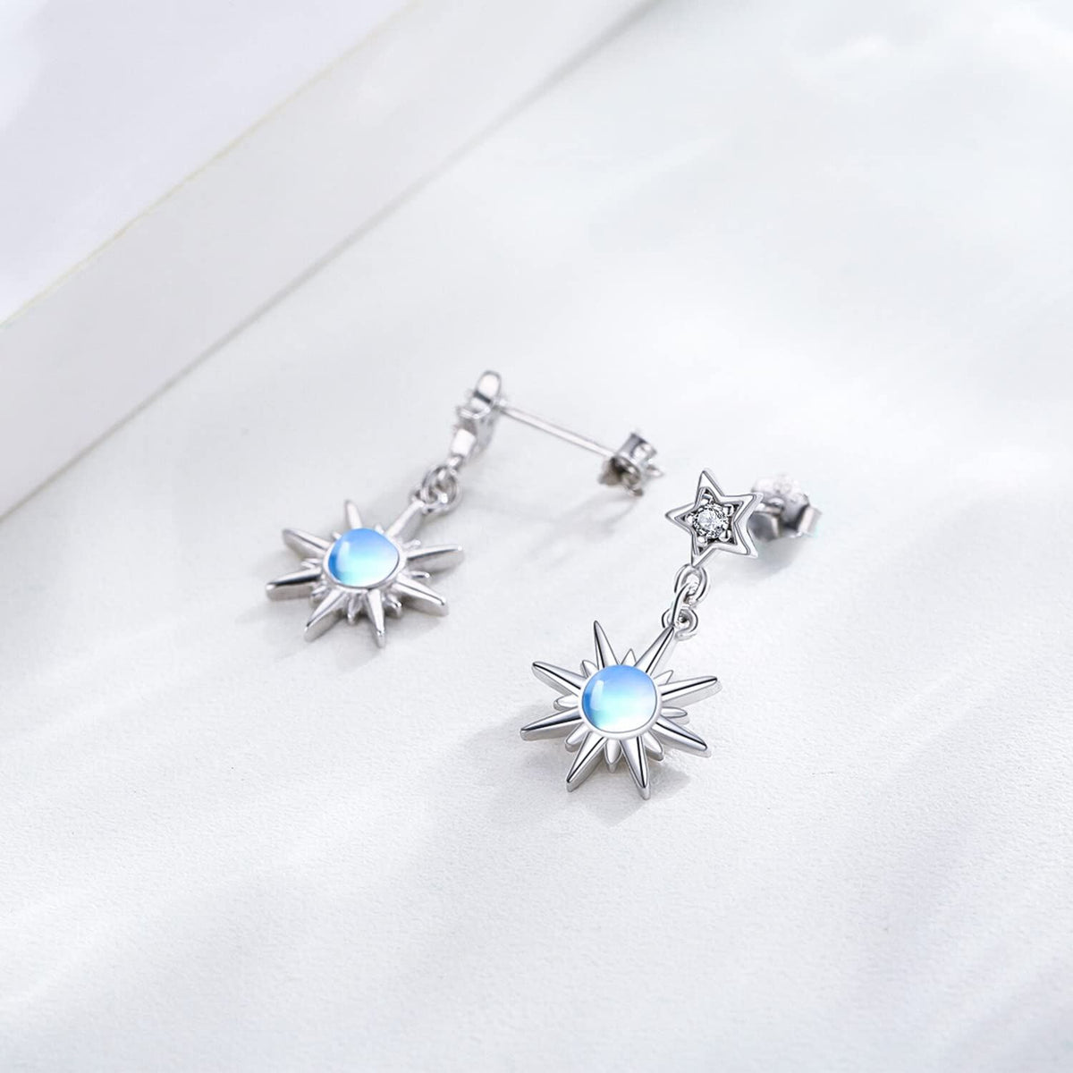 These Sterling Silver Circular Shaped Moonstone Moon & Star Drop Earrings by YFN are enchanting drop earrings for women. Crafted from Sterling silver and beautifully plated in white gold, they feature exquisite moonstone accents in a captivating circular shape, adorned with celestial moon and star motifs, offering a harmonious blend of shimmer and sophistication.
