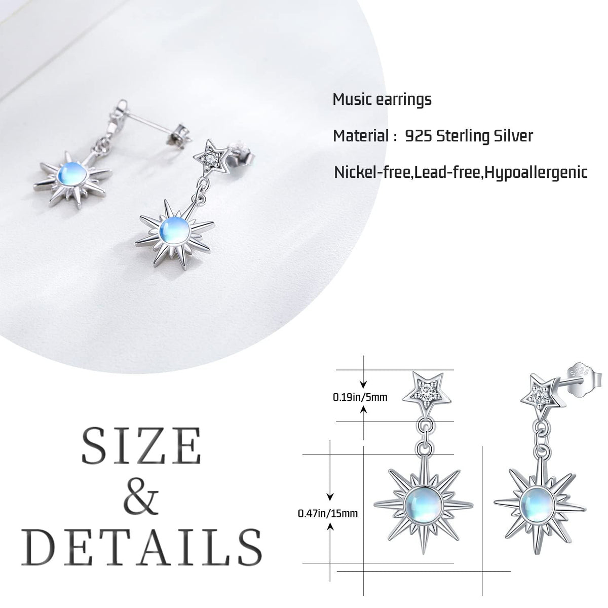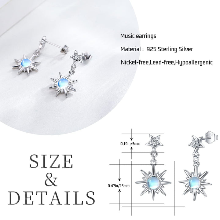 These Circular Shaped Drop Earrings are Crafted from Sterling Silver with White Gold Plating, featuring Exquisite Moonstone Accents, Moon and Star Motifs.