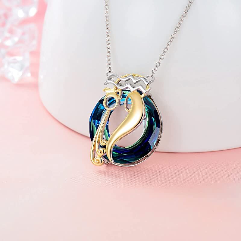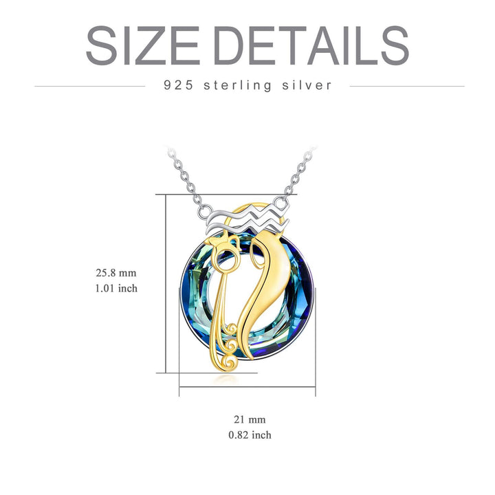 Crafted from sterling silver with silver and gold tones (two-tone). Features a round blue crystal pendant. Embodies the Aquarius zodiac spirit.
