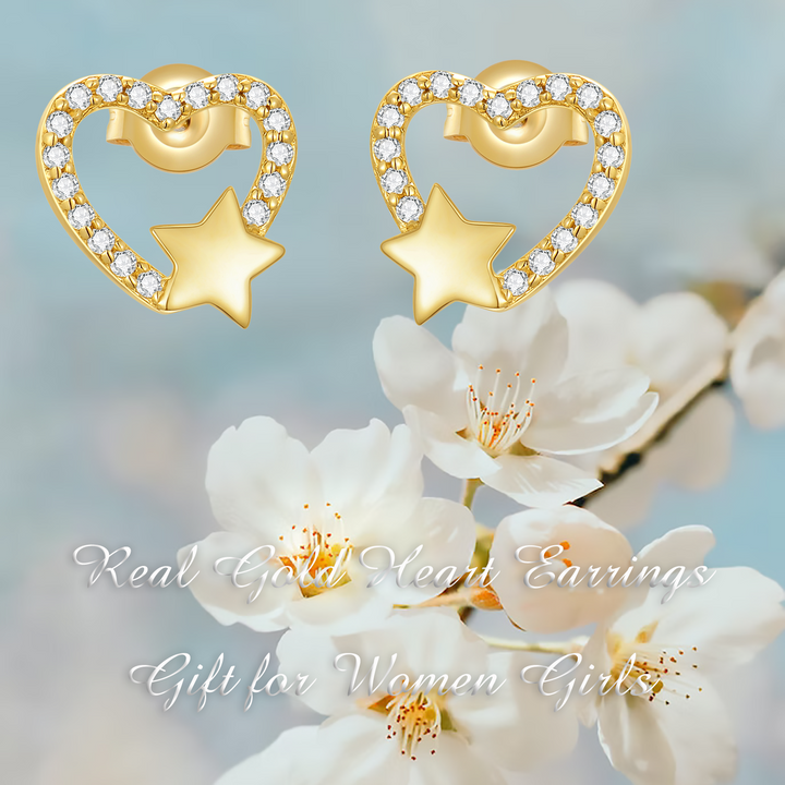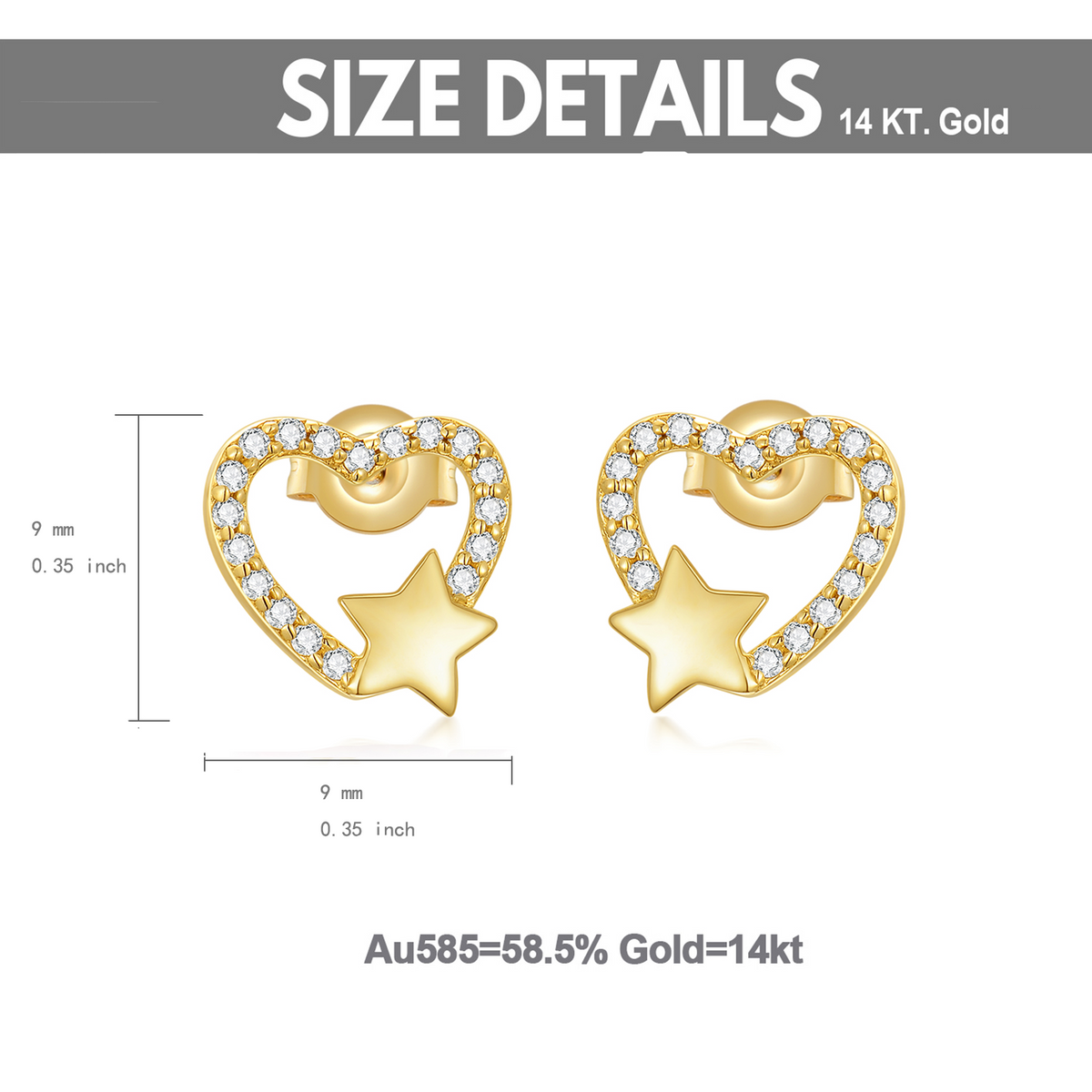 14K Gold Round Cubic Zirconia Heart & Star Stud Earrings