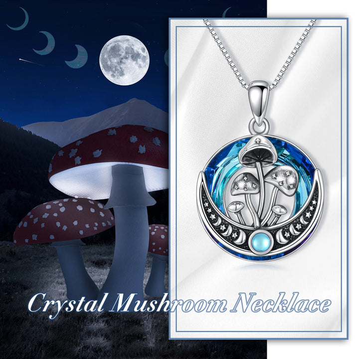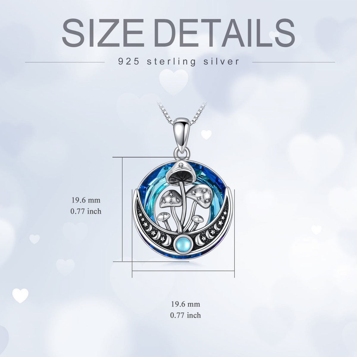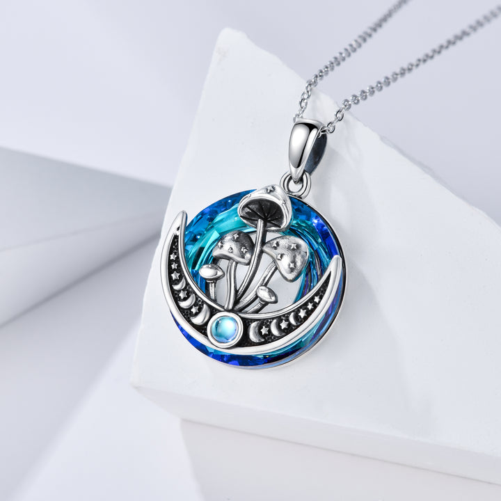 Crafted from Sterling Silver with a retro silver finish, featuring a Circular Shaped Pendant with Mushroom and Moon motifs, Crystals, and a Blue Moonstone.