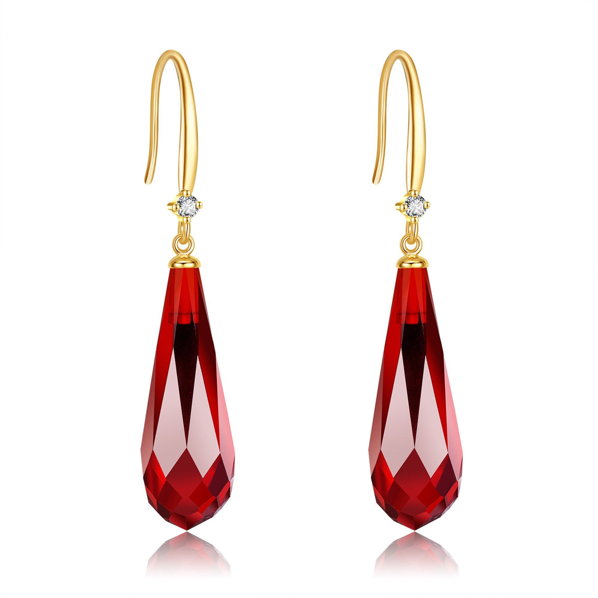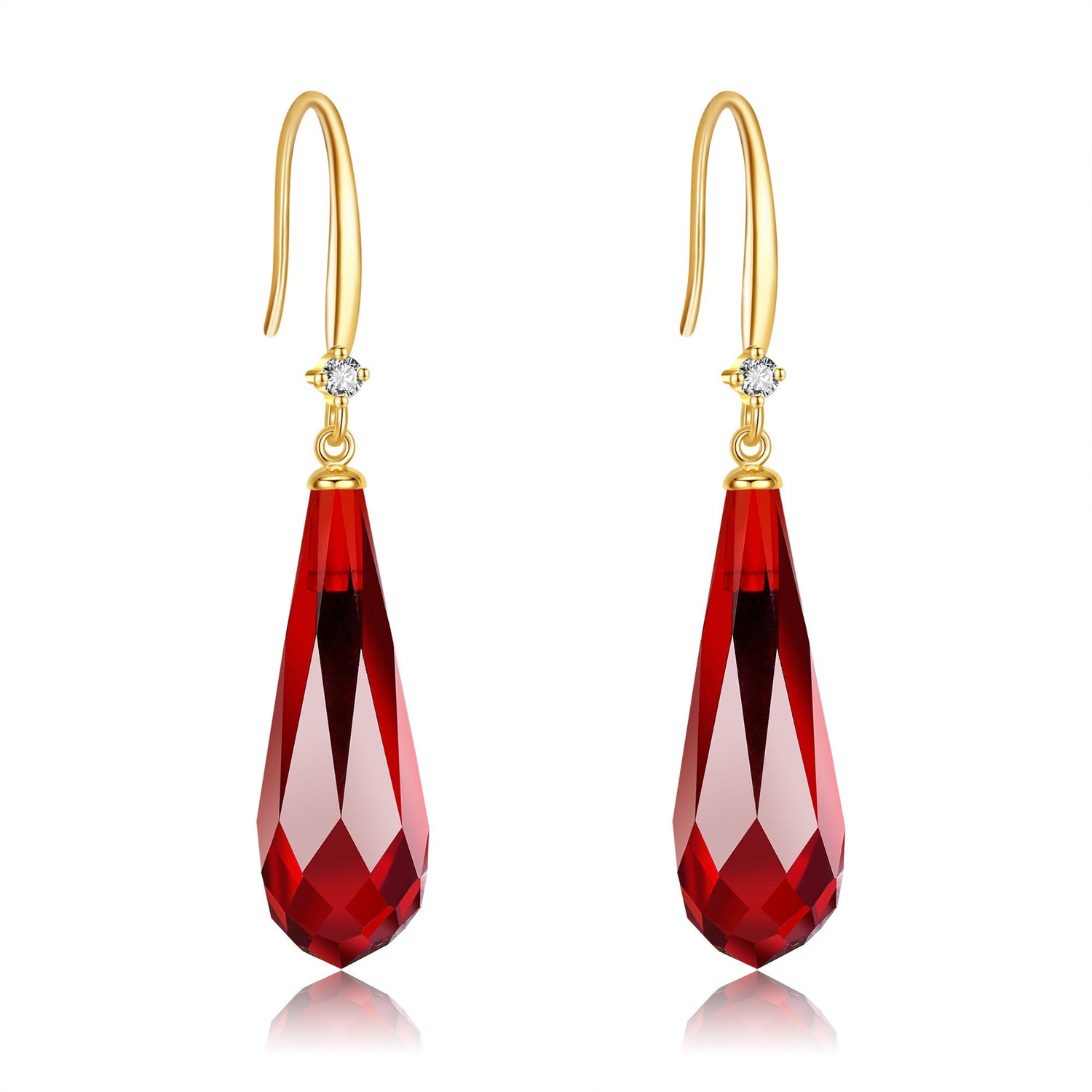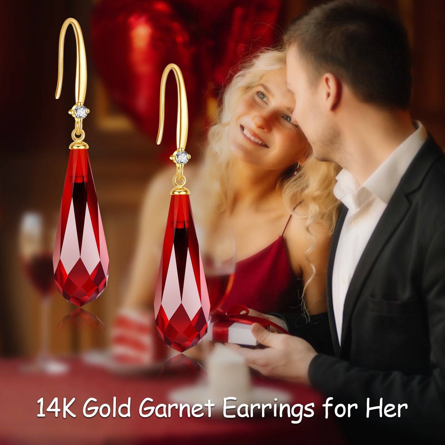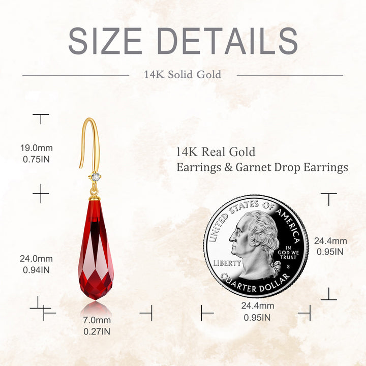 14K gold. Garnet drop stones. Lightweight drop earring design with secure clasp.