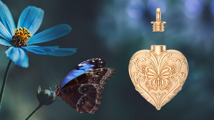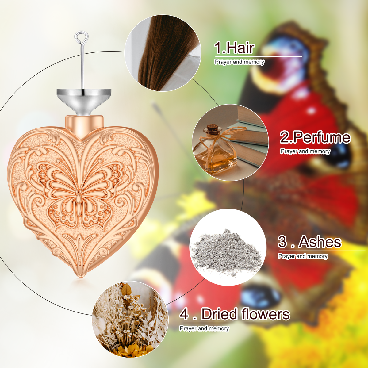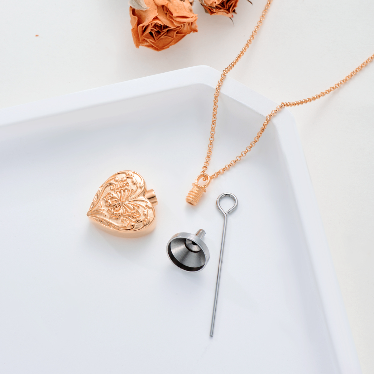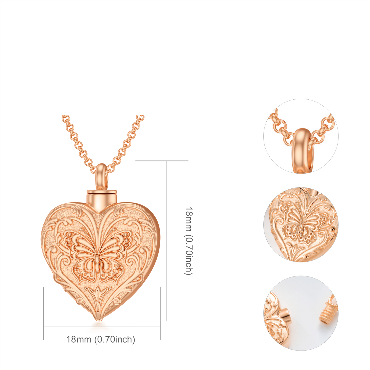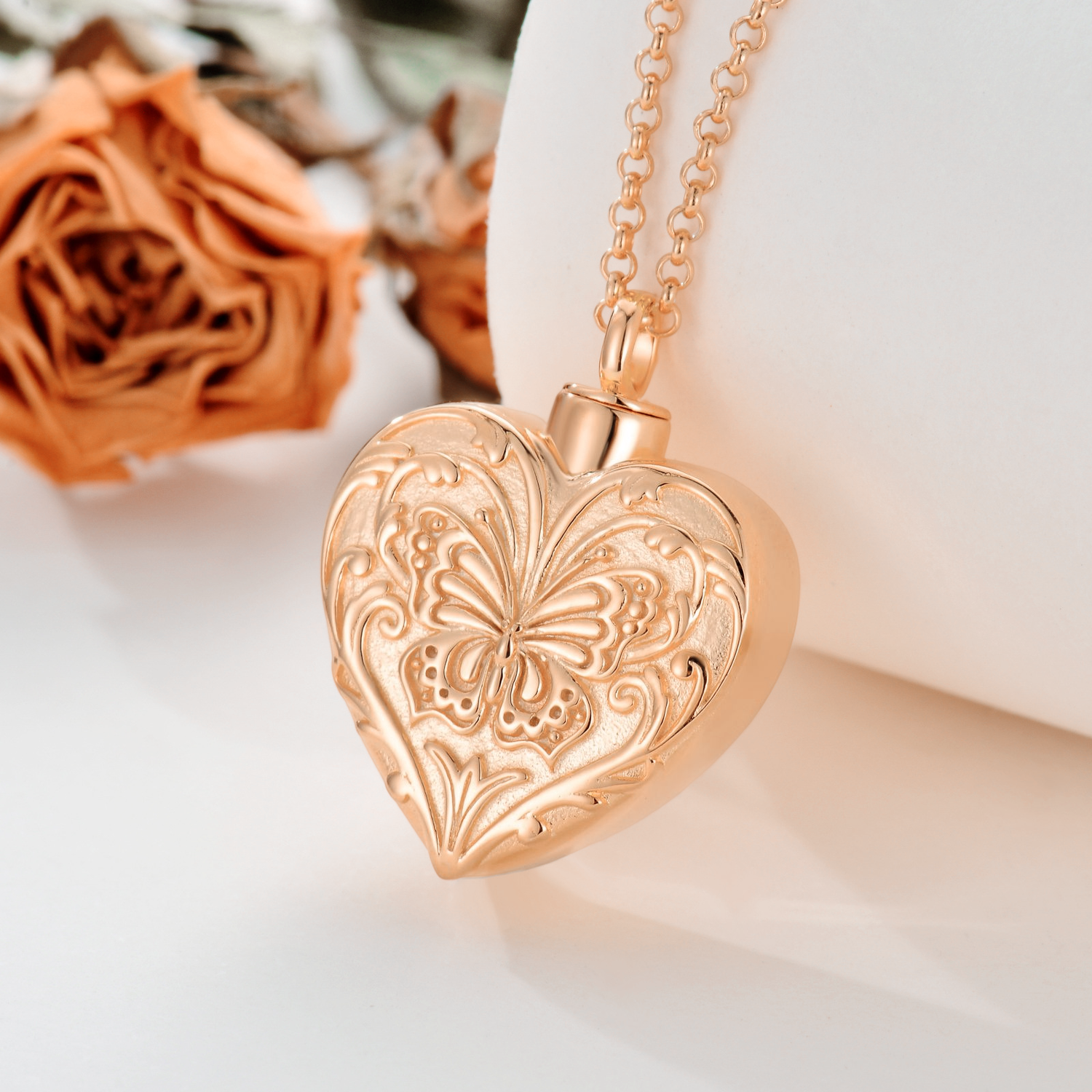 This no-stone Urn Necklace for Ashes is a Unisex Piece Crafted from Durable 10K Rose Gold, Featuring a Butterfly Design and Personalized Engraving.