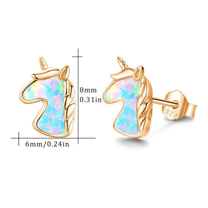These Women's Stud Earrings are crafted from Sterling Silver with Rose Gold Plating, Featuring a Unicorn Design Adorned with Luminous Opal Stones.