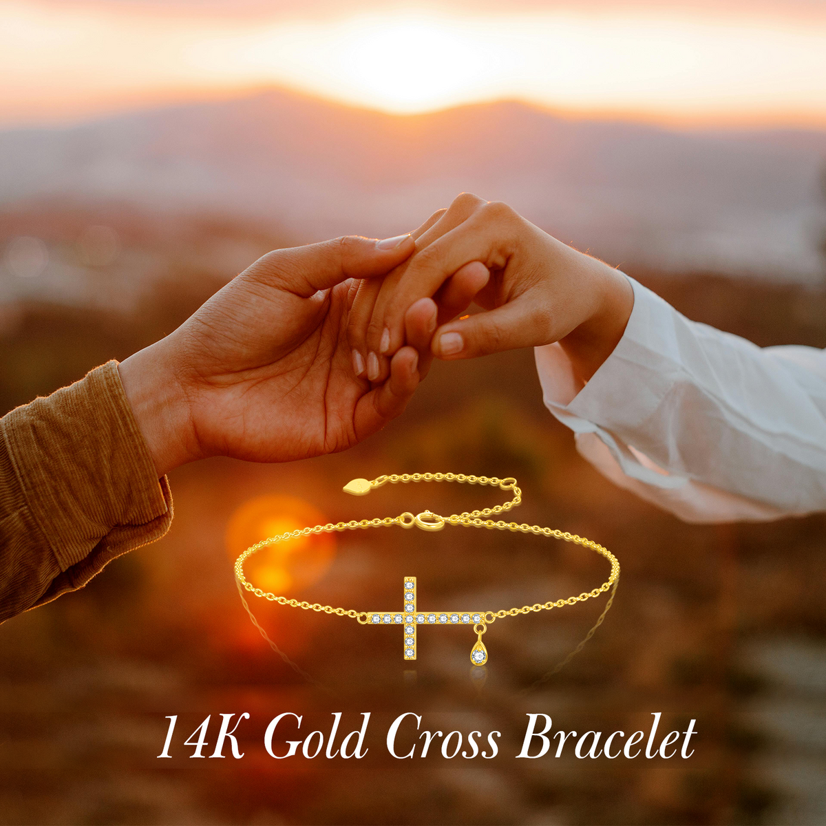 Charm bracelet crafted from solid 10K gold. Features drop-shaped clear Cubic Zirconia stones and a cross charm. Bracelet length 7 inches with a lobster clasp closure.