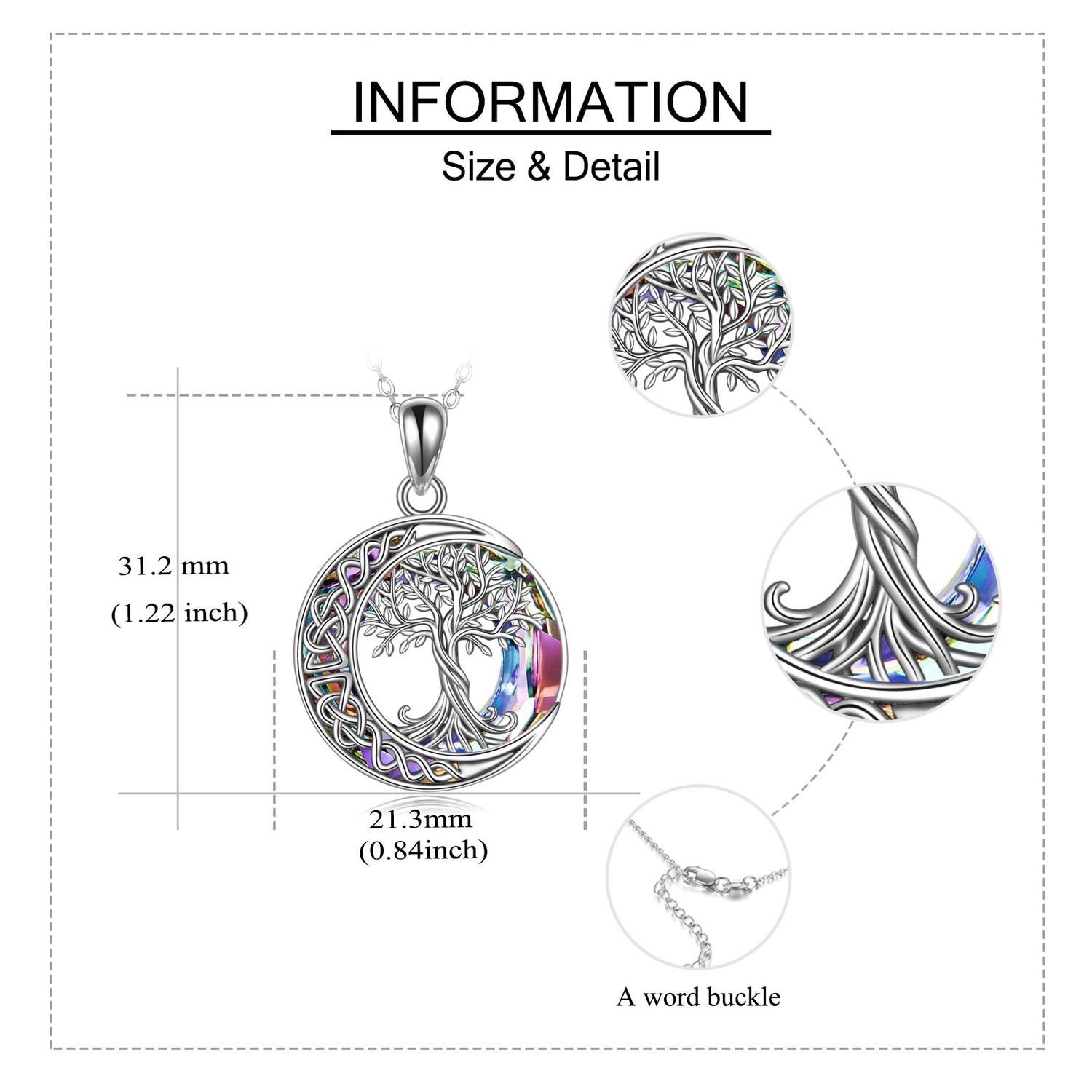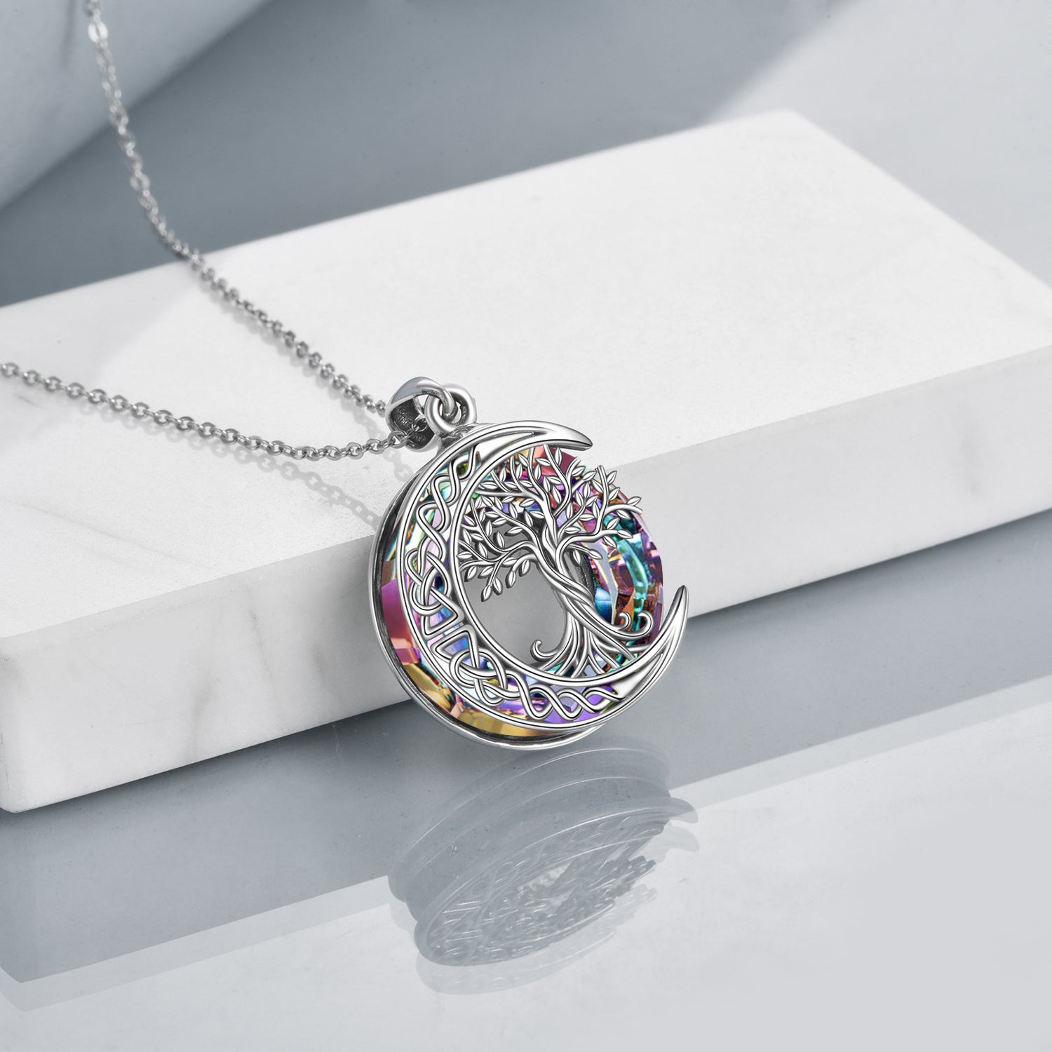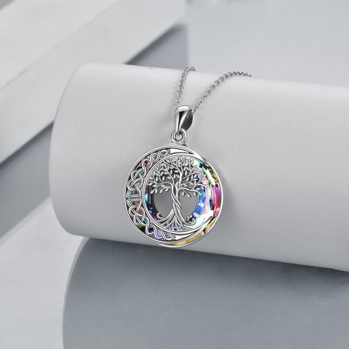 Sterling Silver Round Crystal Tree Of Life Moon With Celtic Knot Pendant Necklace For Women