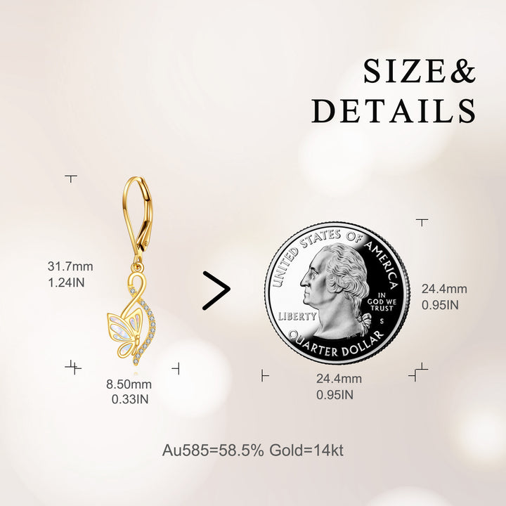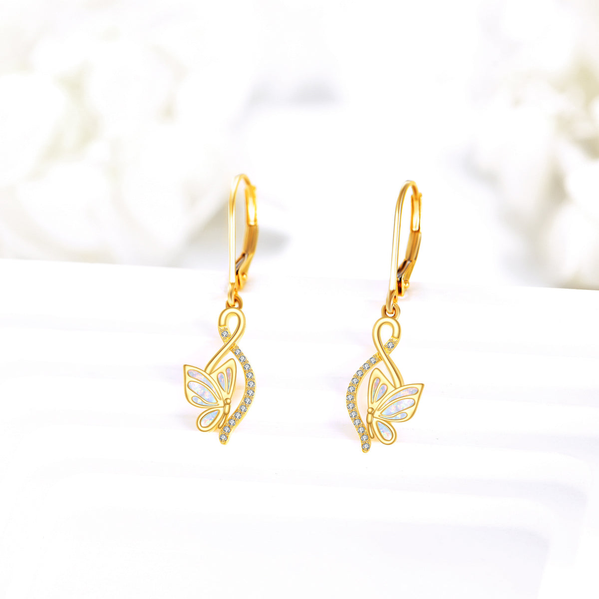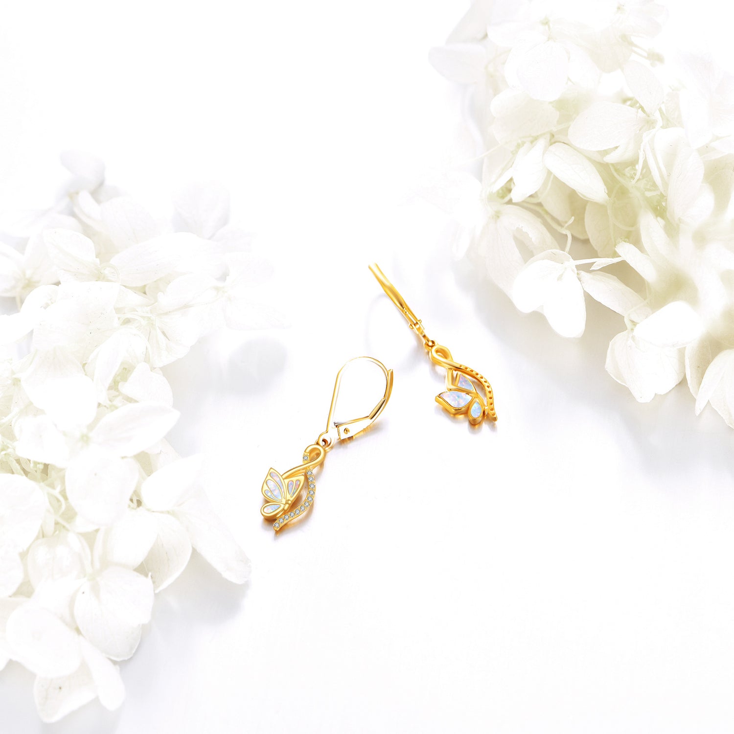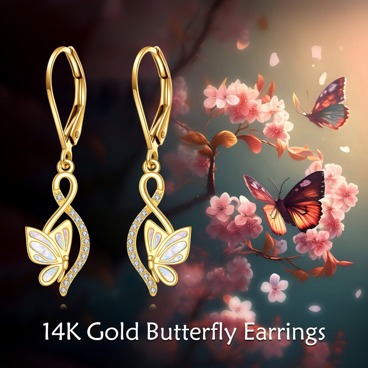 These drop earrings are made of 14K gold. They feature a delicate butterfly design embellished with iridescent, genuine opal gemstones, secured with standard hooks.