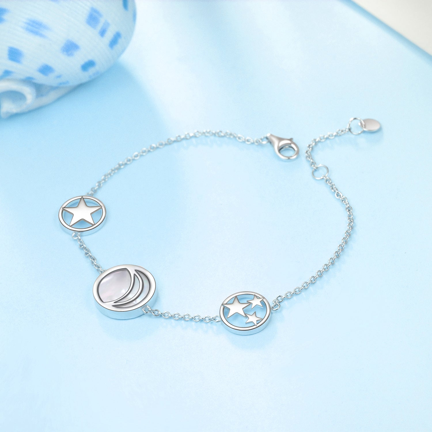This charm bracelet is crafted from Solid 925 Sterling Silver, finished with a White Gold Plating, and features a round natural Opal centerpiece set within a moon charm.