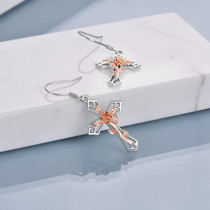 These no-stone Drop Earrings are Crafted from Genuine Sterling Silver with a Silver and Rose Gold Finish (Two-tone), featuring a Detailed Rose & Cross Motif.