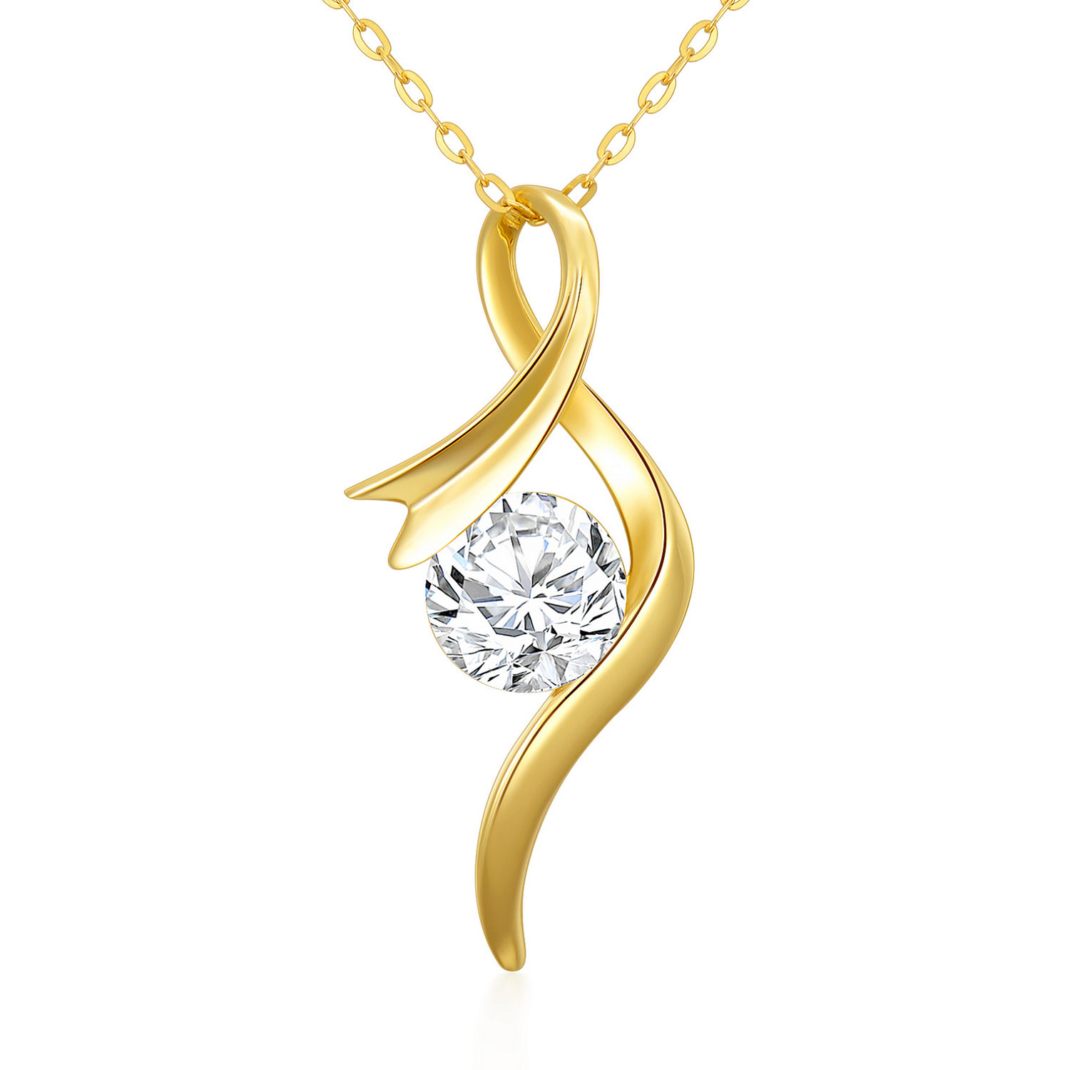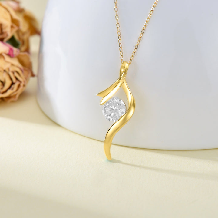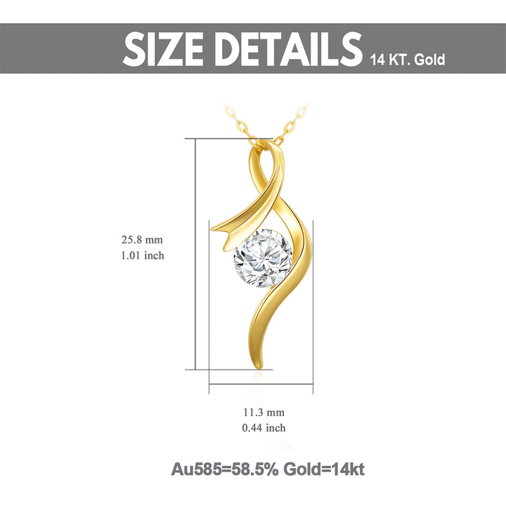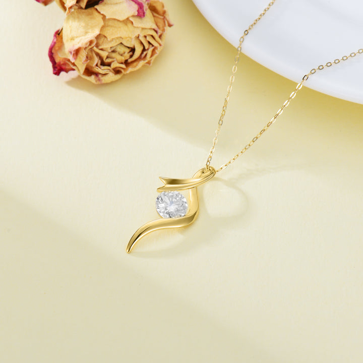 This Women's Pendant Necklace is crafted from Luxurious 14K Gold, Featuring a Radiant Round Moissanite Center Embraced by a Delicate Ribbon Design.