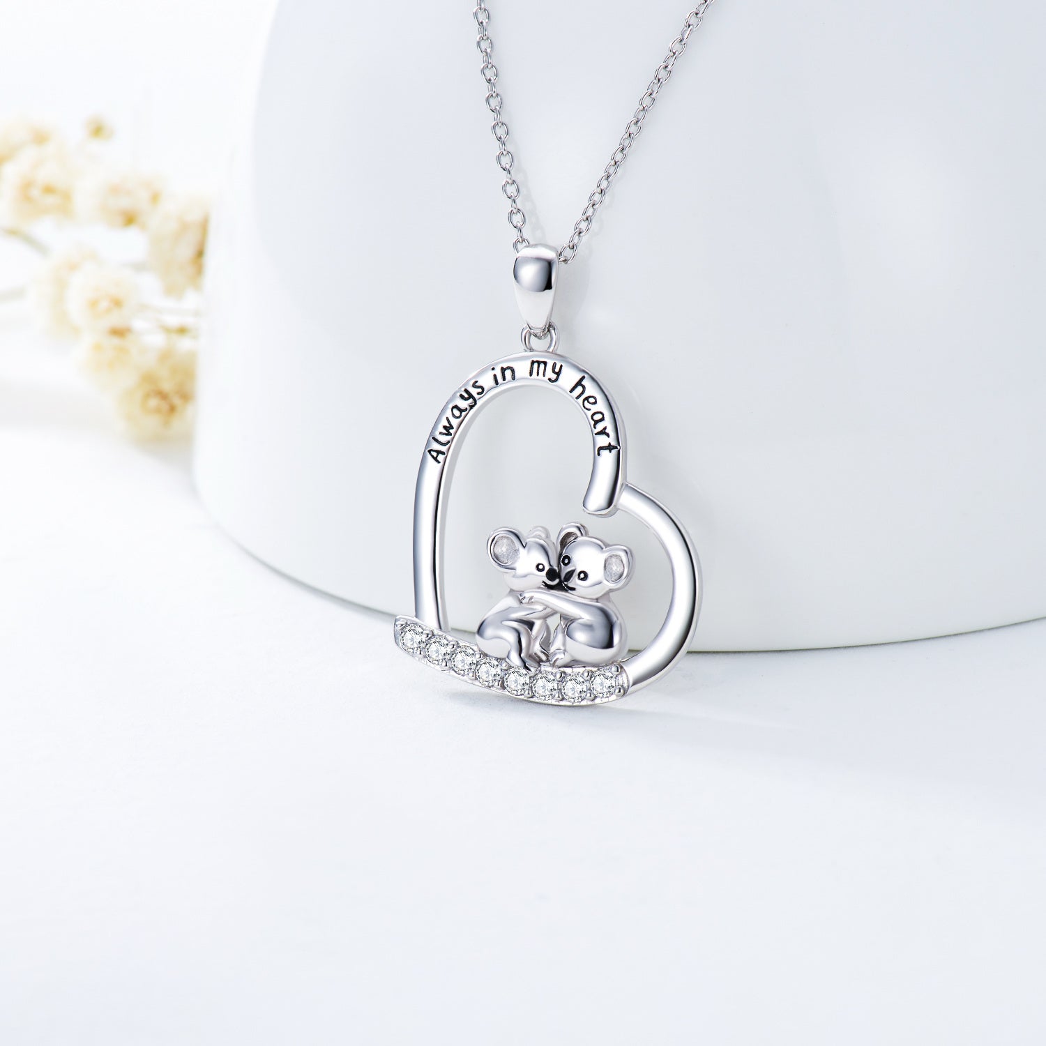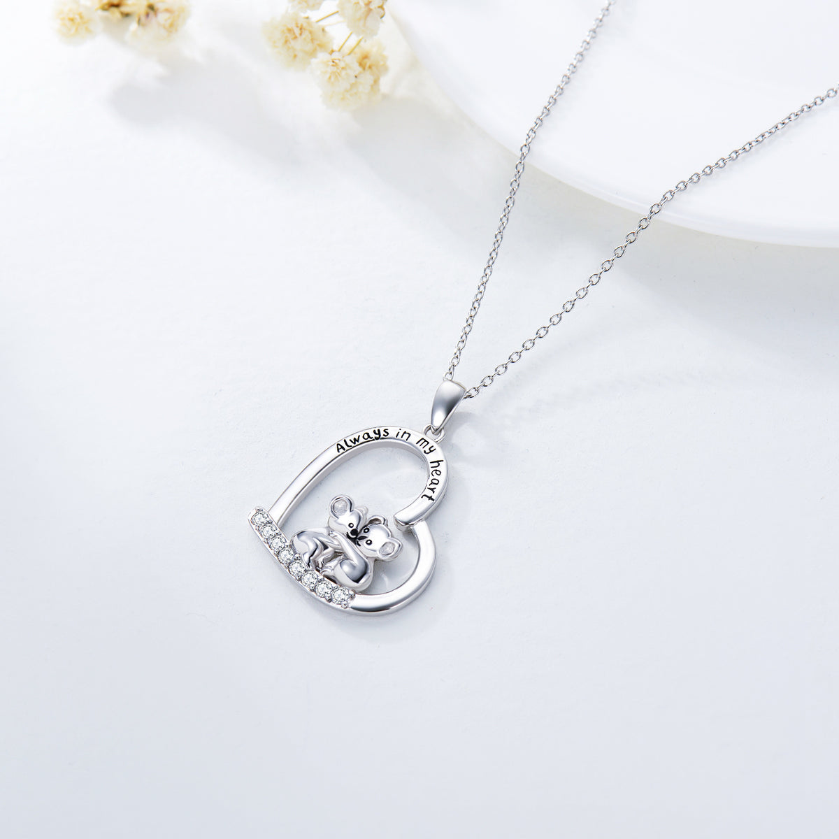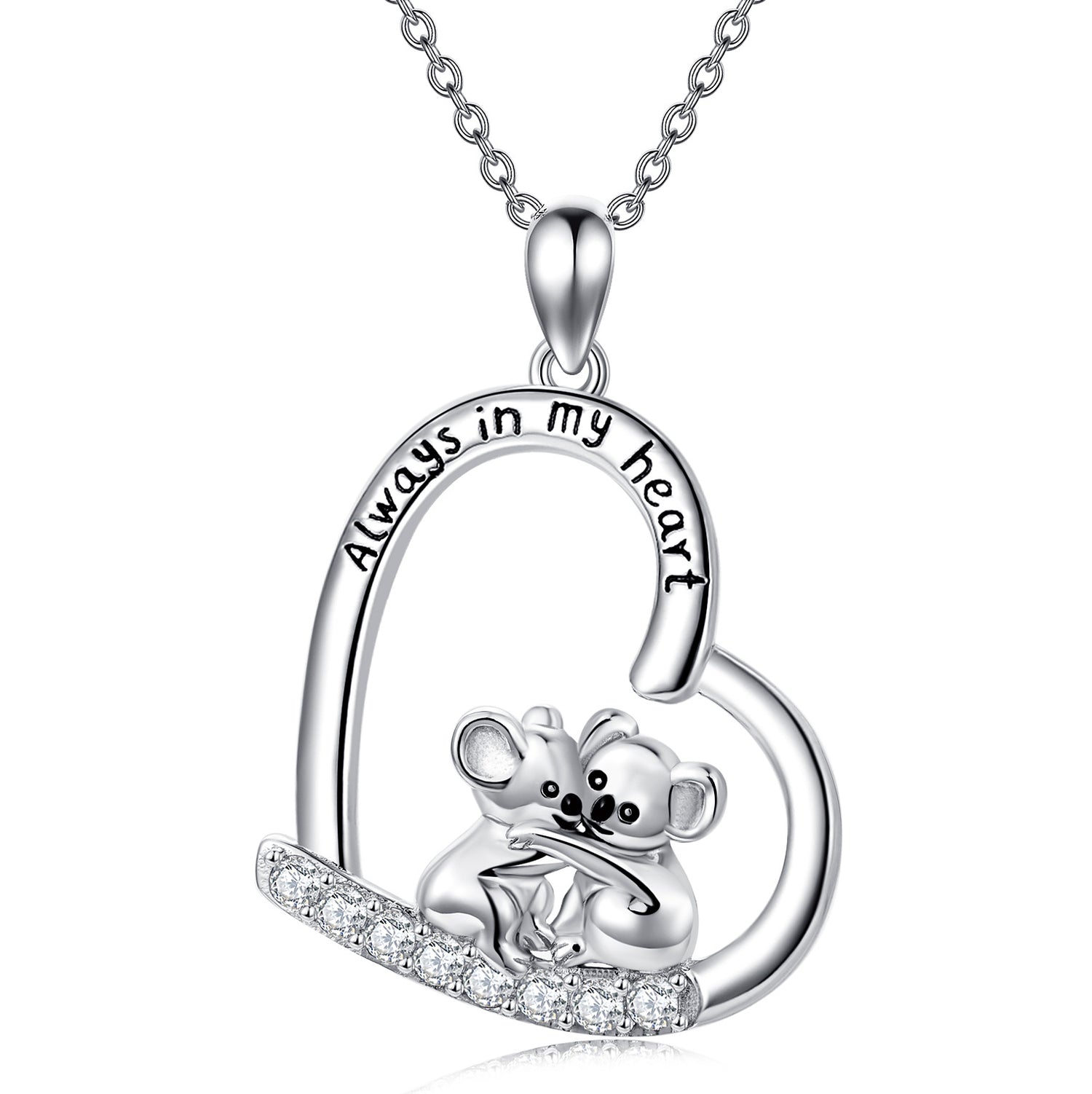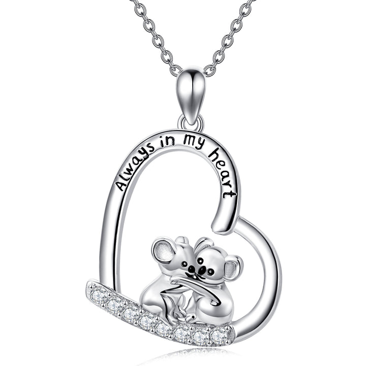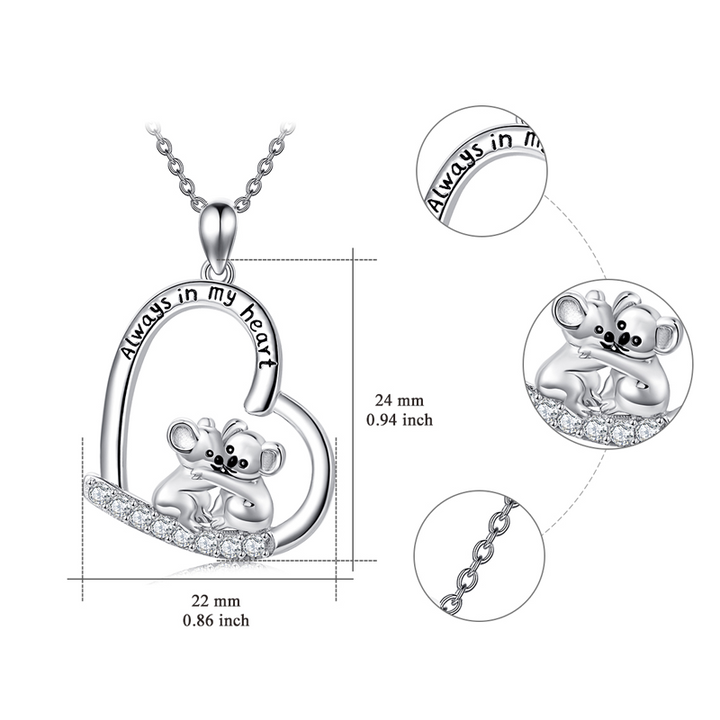 Pendant necklace in sterling silver, white gold plated, circular shape. Set with clear cubic zirconia stones. Features a koala and heart design. Engraved with "Always In My Heart." Pendant measures 0.85 inches by 0.85 inches on an 18-inch rolo chain with a spring-ring clasp.