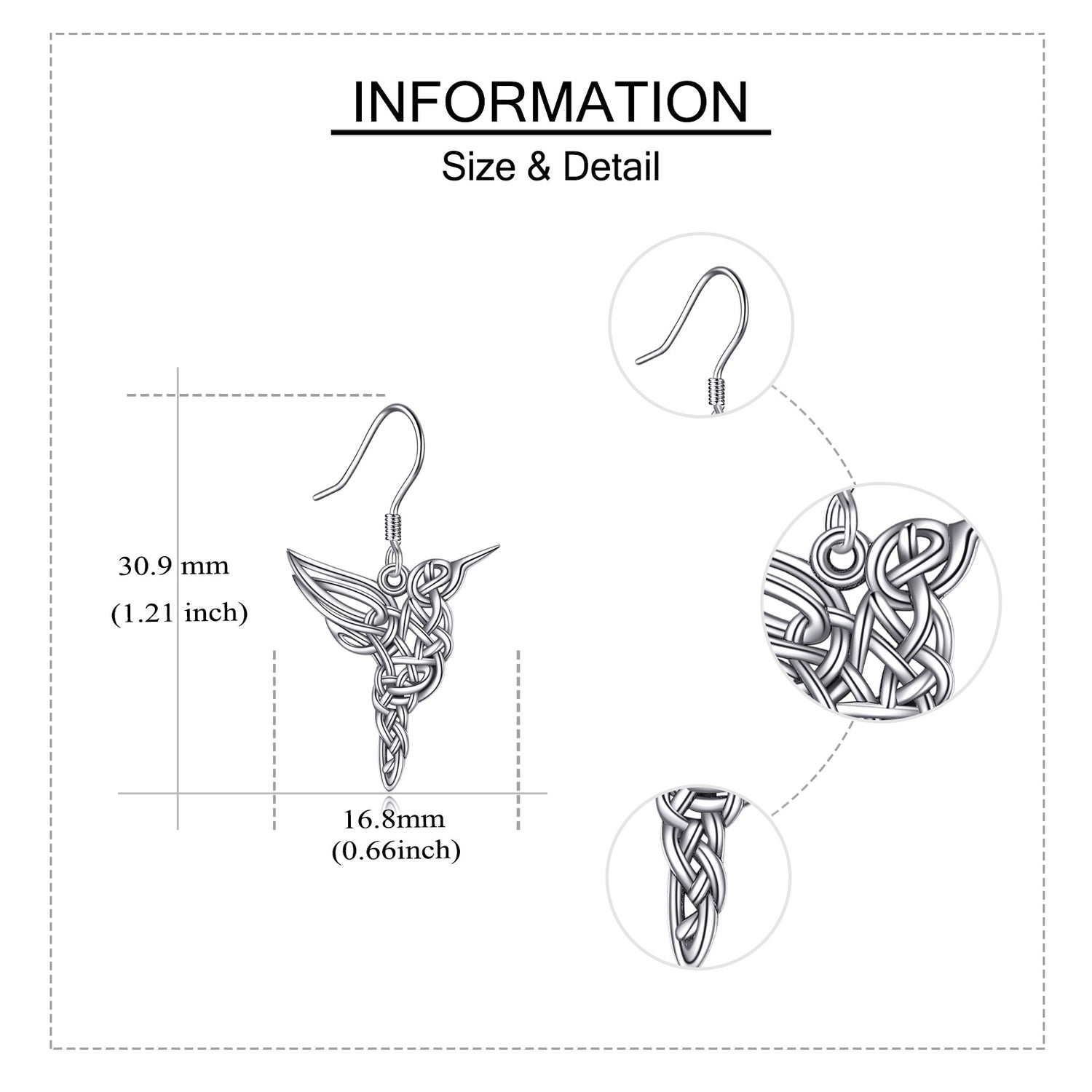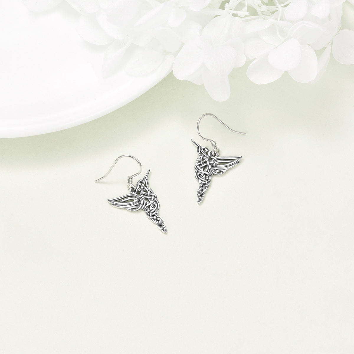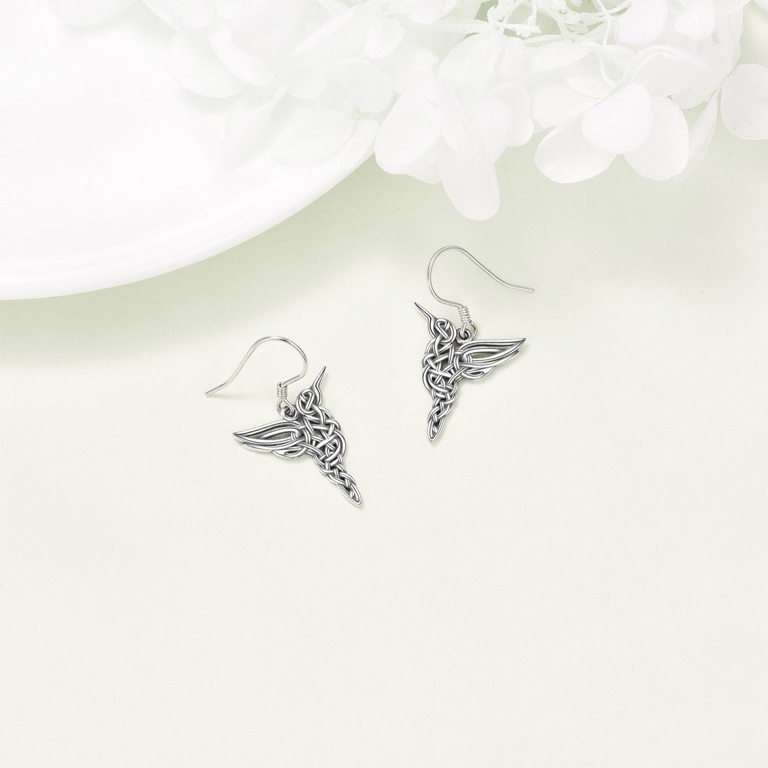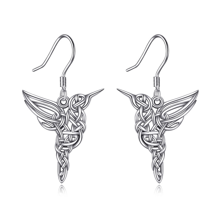 These Drop Earrings are crafted from High-Quality Sterling Silver with a Retro Silver Finish, featuring Elegant Hummingbird and Celtic Knot Motifs.