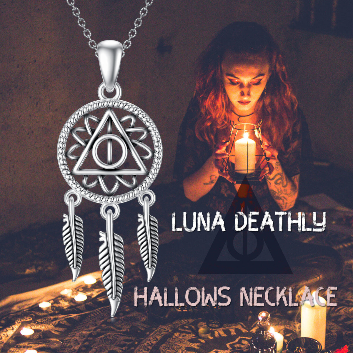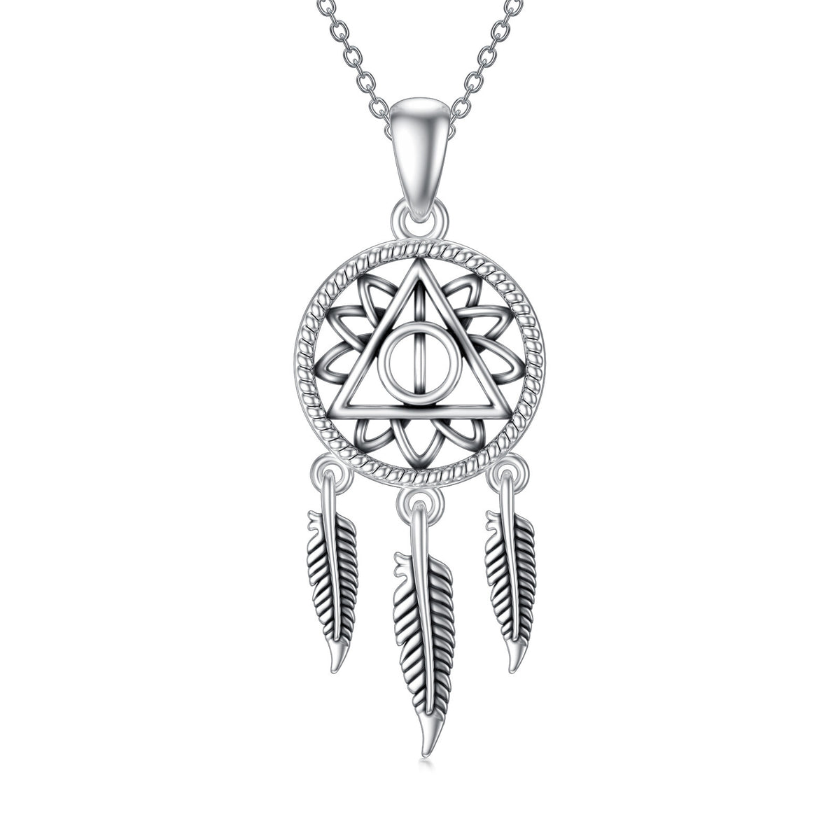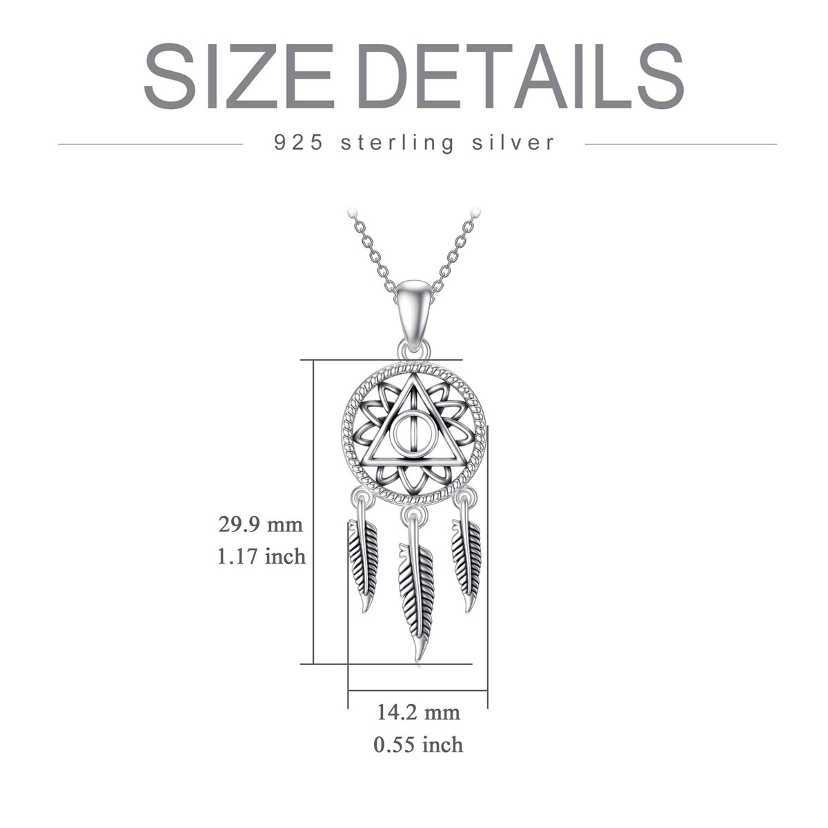 Sterling silver with white gold plating; dream catcher motif; silver chain; no stones.