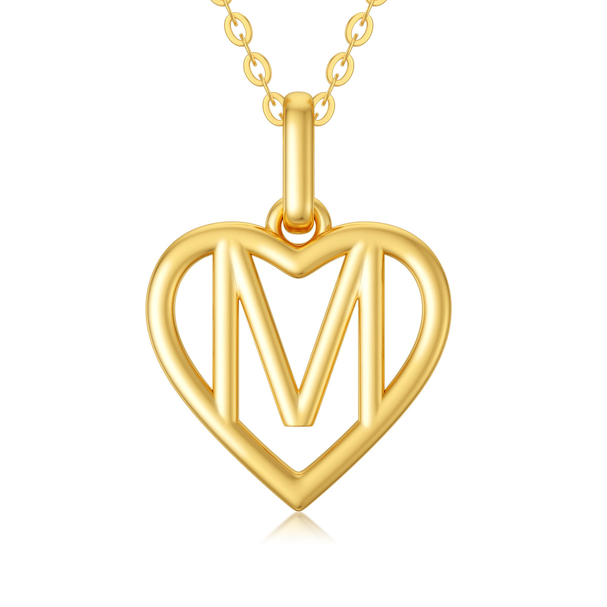 This heart pendant necklace is crafted from solid 14K Gold in a stone-free design and includes an Initial Letter M accent, suspended from a fine gold chain.