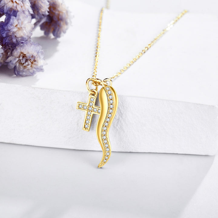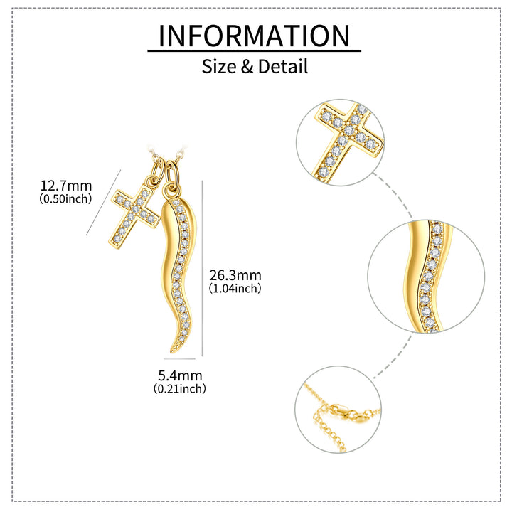 This Gold Vermeil Cubic Zirconia Cross Italian Horn Necklace for Women by YFN is an exquisite necklace for women, blending classic and contemporary style. Crafted from sterling silver, elegantly plated in yellow gold (Gold Vermeil), it is beautifully adorned with cubic zirconia and features symbolic cross and Italian horn charms, offering a versatile elegance.