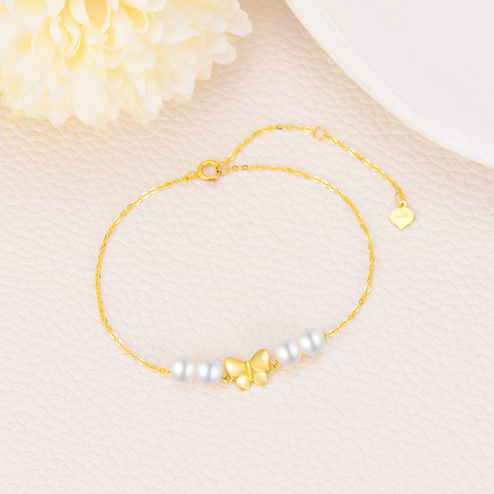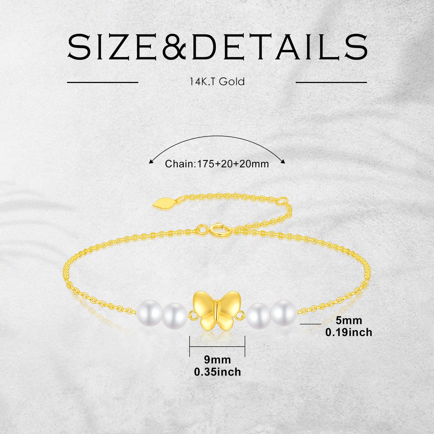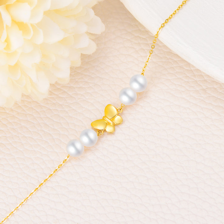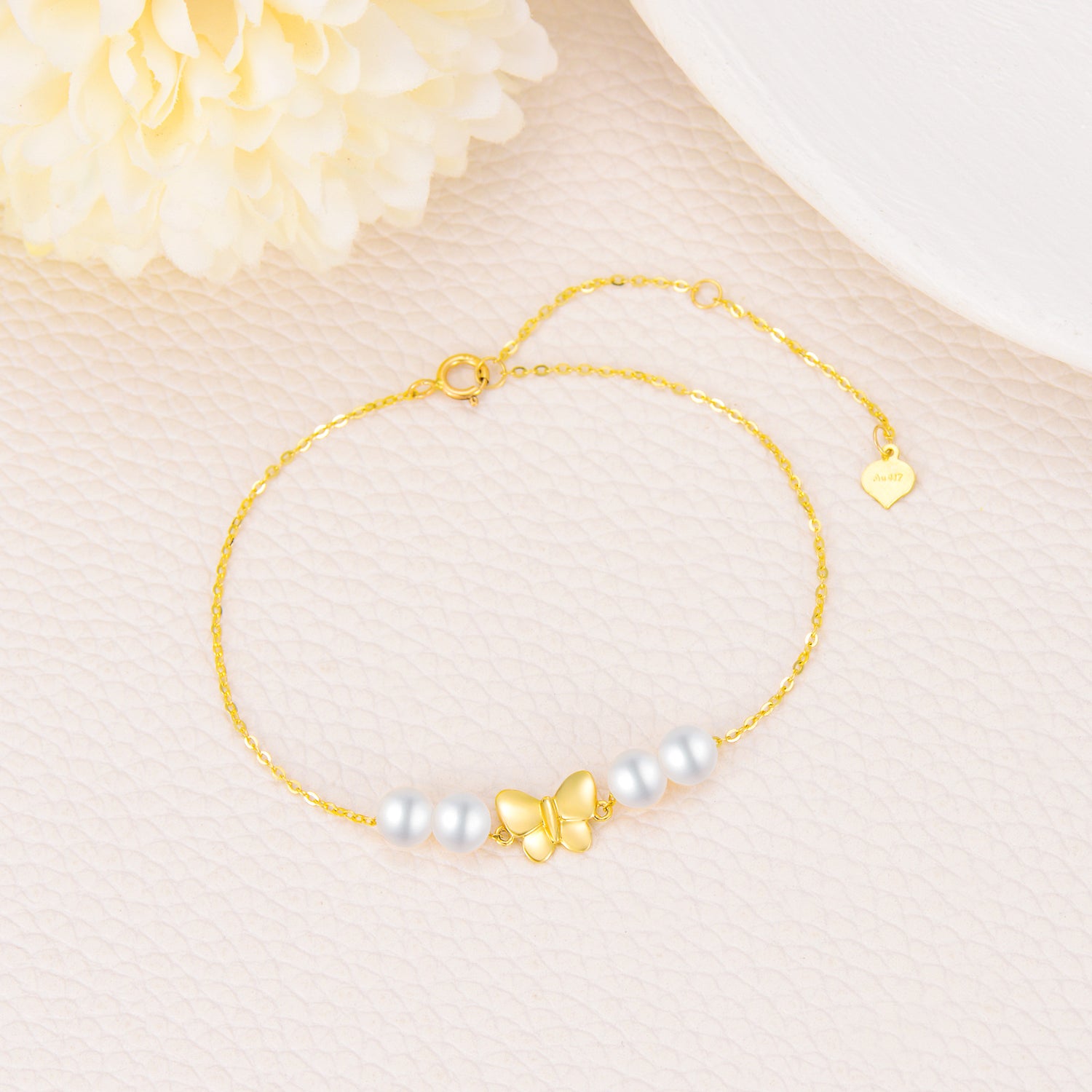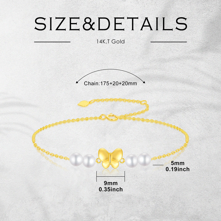 Crafted in 14K gold with pearl and butterfly charm. Standard bracelet length and clasp per YFN.