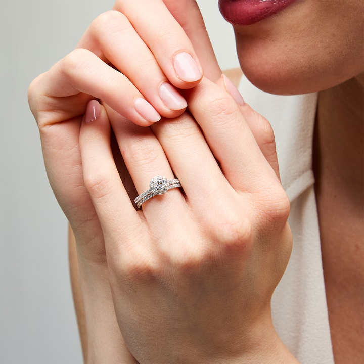 Crafted from 14K White Gold, featuring a Wedding Ring/Bridal Set with a Round Cut Lab-Created Diamond (Center Stone 0.5 to 3 CT, Total Weight up to 3.5 CT, D Color, VVS1-VS1 Clarity, 3EX, IGI Certified) in a Halo of Baguette Diamonds with Personalized Engraving option.