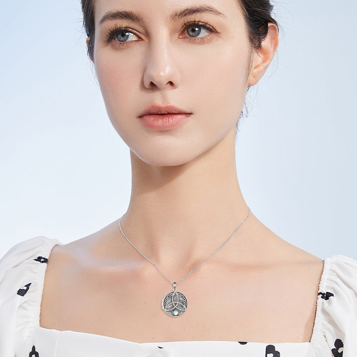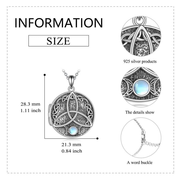This Circular Shaped Photo Locket Necklace is a Unisex Piece Crafted from High-Quality Sterling Silver with a Retro Silver Finish, Featuring a Moonstone Centerpiece and an Intricately Designed Celtic Knot.