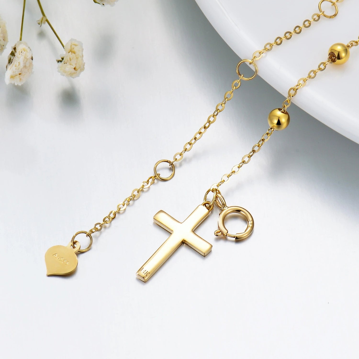 14K Gold Cross & Heart Bracelet With Solid Gold Bead Station Chain For Women