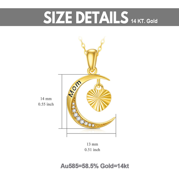 Crafted from solid 14K Gold. This is a Pendant Necklace featuring Heart & Moon motifs (no stones).