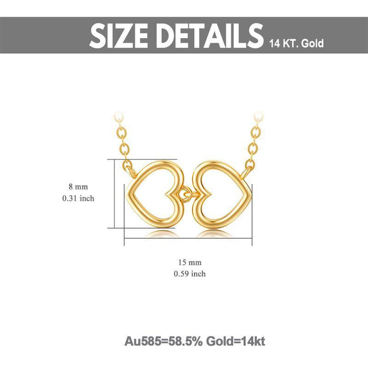 This interlocking heart pendant necklace is crafted entirely from Solid 14K Gold and is suspended from an adjustable 17-inch matching gold chain.