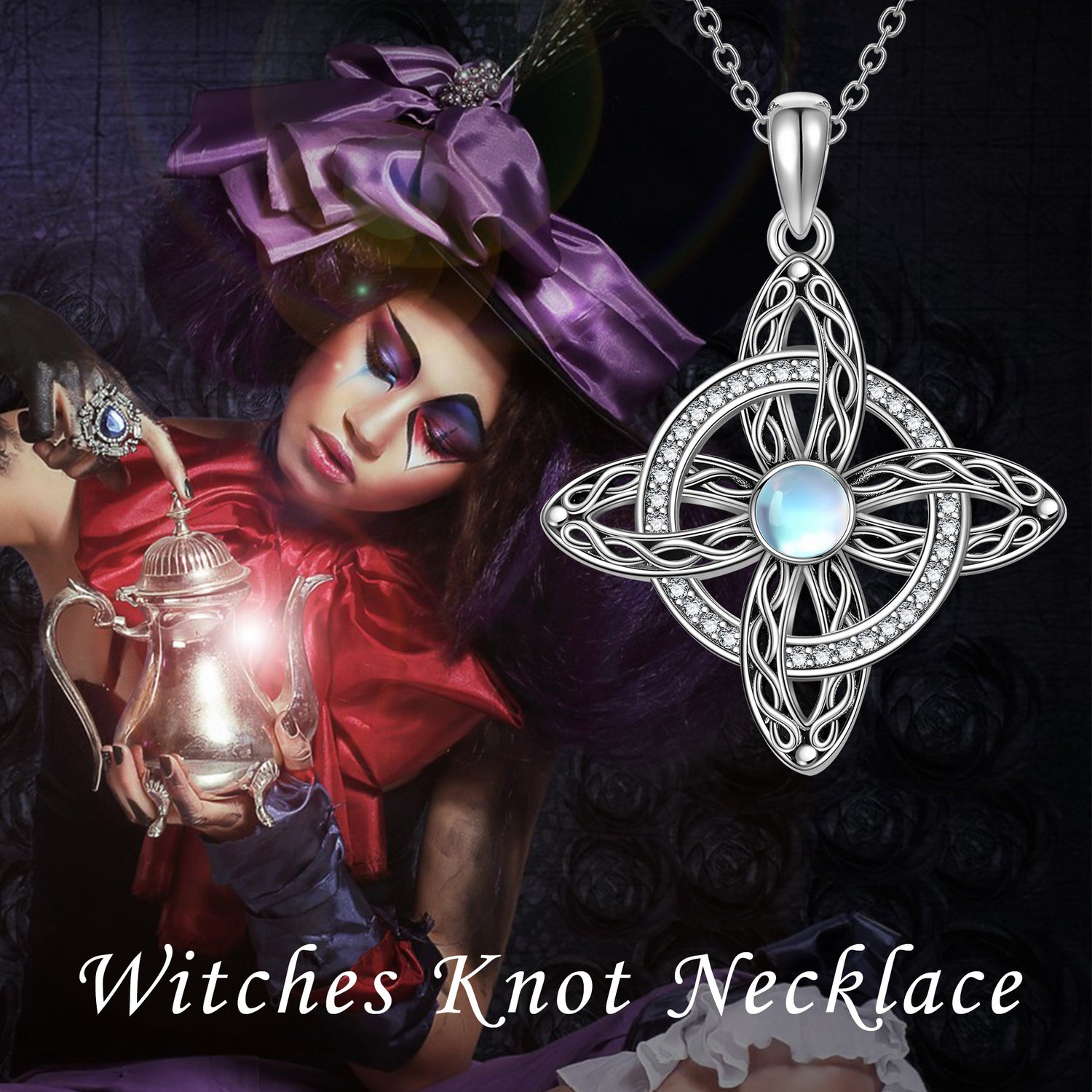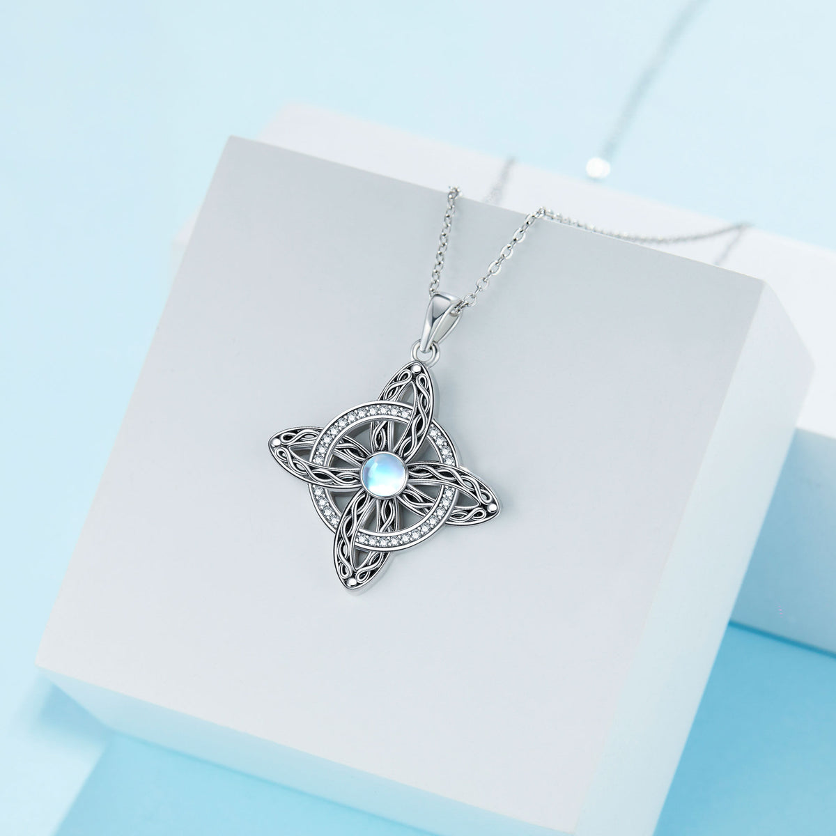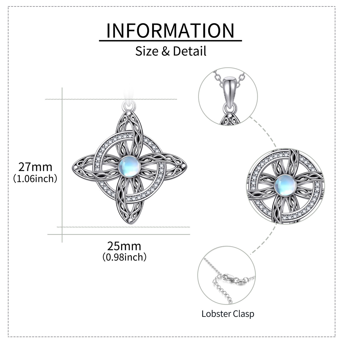 This Round Pendant Necklace is crafted from High-Quality Sterling Silver with a Retro Silver finish, featuring a Mesmerizing Moonstone and Intricate Celtic Knot and Cross designs.