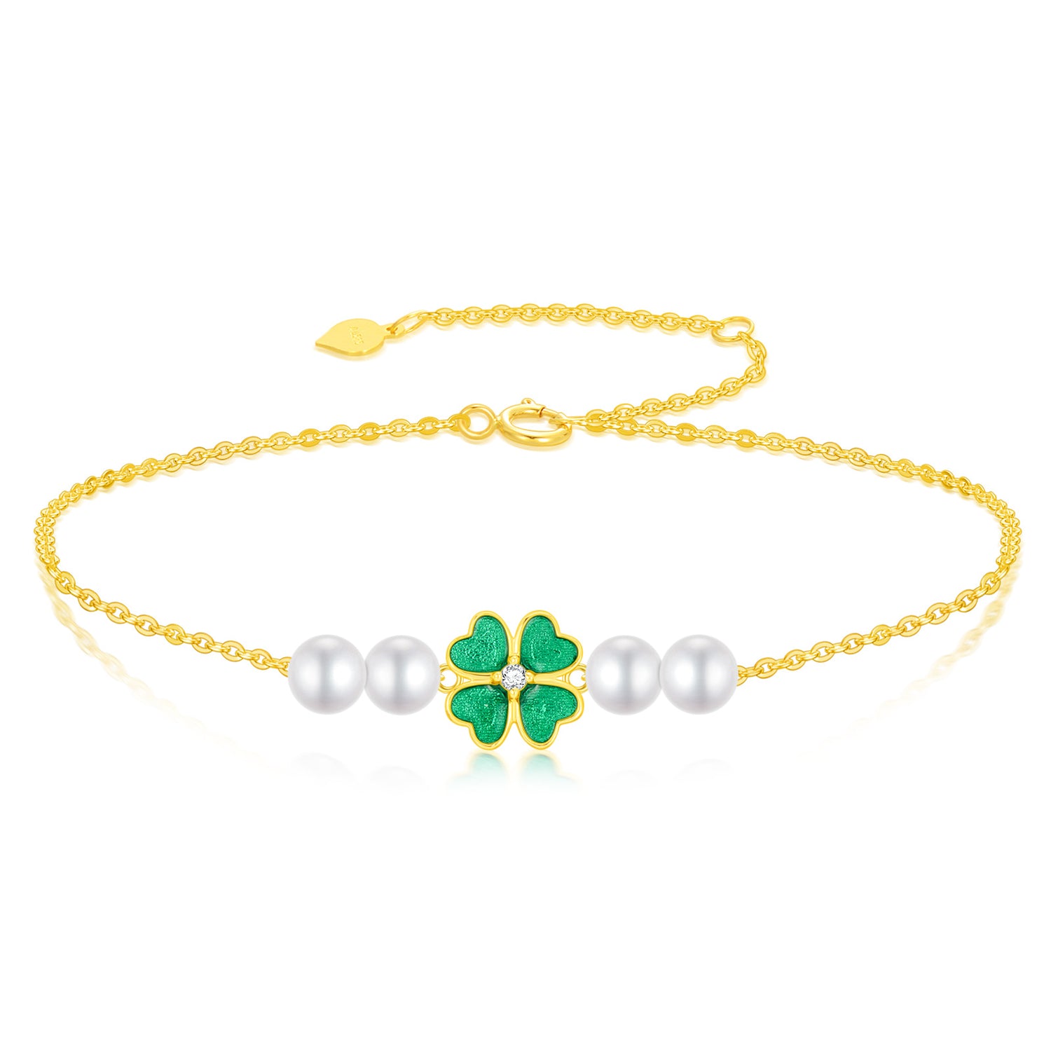 14K gold; pearls; four leaf clover charm; bracelet chain.