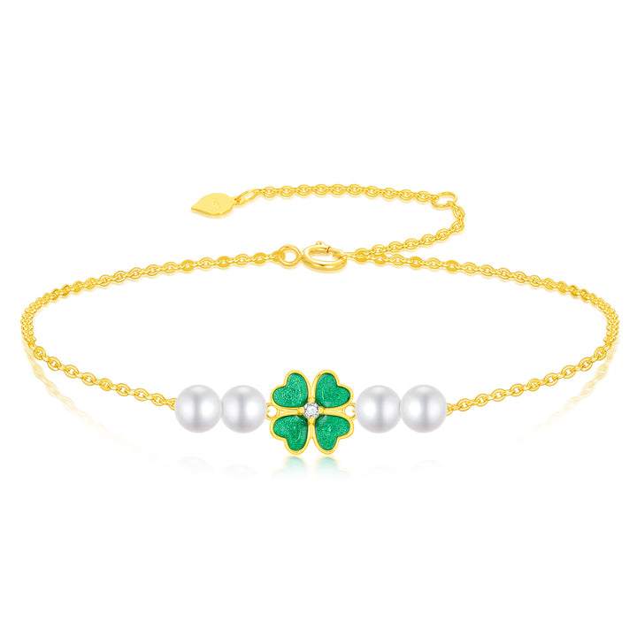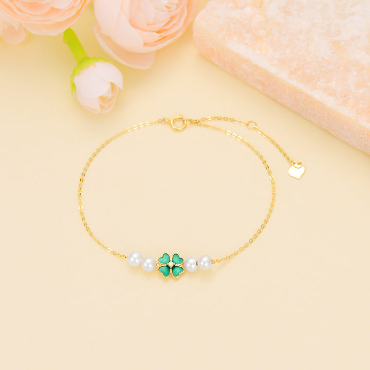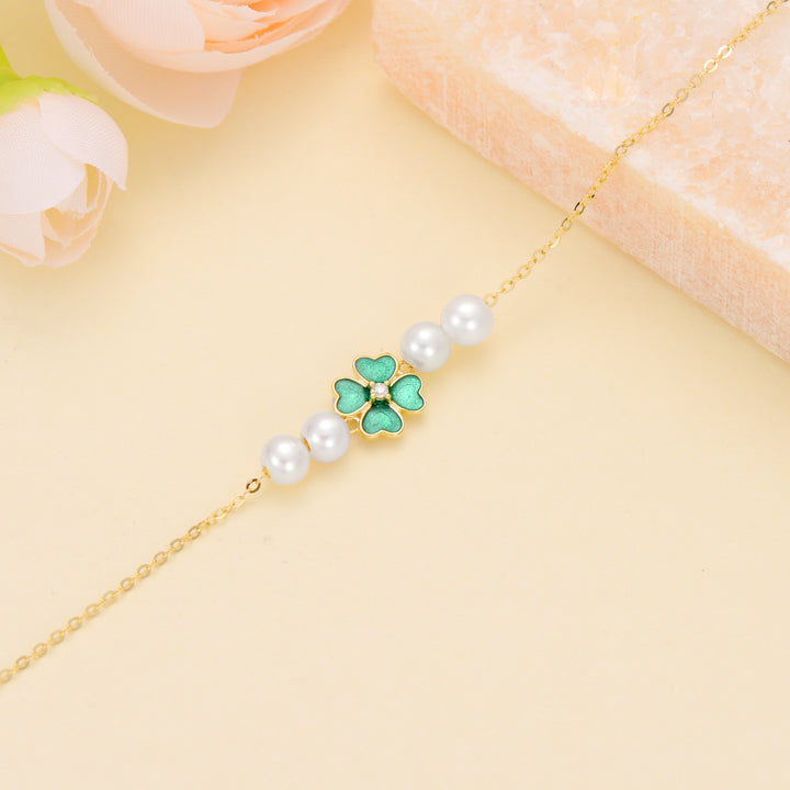14K Gold Pearl Four Leaf Clover Charm Bracelet