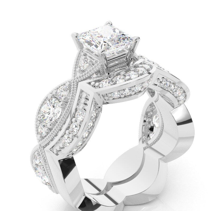 This 14K White Gold 2.2 CT.T.W. Princess Cut Lab Created Diamond 4 Prong Setting Side Stone Halo Engagement Ring by YFN is the perfect IGI-certified symbol of everlasting commitment for couples. This vintage-inspired halo engagement ring features a breathtaking 1 CT princess cut lab-created diamond with exquisite D color and VVS1 clarity. Weighing a total of 2.2 CT with outstanding polish and symmetry, this ring is designed to elevate your love story with elegance, quality, and brilliant sparkle.