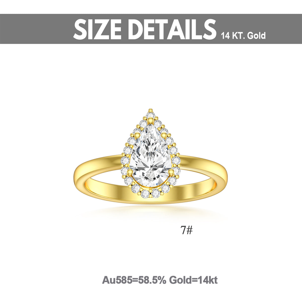 Solid 14K gold engagement ring. Center stone: Clear pear-shaped Moissanite gemstone. Features a drop shape setting.